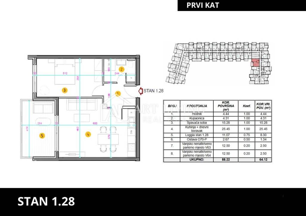 L'appartamento si trova al 1° piano di un edificio nuovo e moderno dotato di ascensore. La superficie totale dell'appartamento è di 64,12 m2. Si compone di un soggiorno con cucina e sala da pranzo, un bagno e una camera da letto. Dal soggiorno si accede ad un balcone coperto di 11,07 mq. L'appartamento dispone di un ripostiglio e di due posti auto esterni.