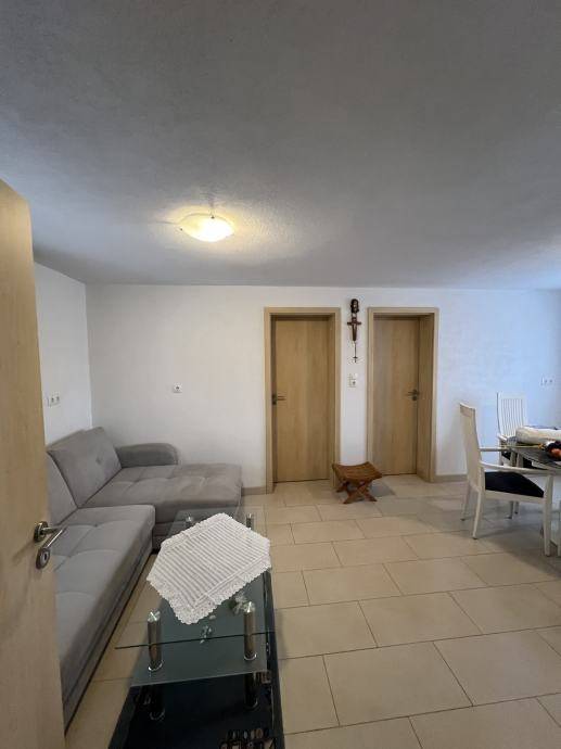 U prizemlju se nalazi apartman sa dnevnim boravkom, kuhinjom, kupaonicom s wc-om, ostavom, dvije spavaće sobe, terasom i vanjsim tušem.