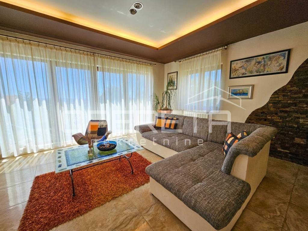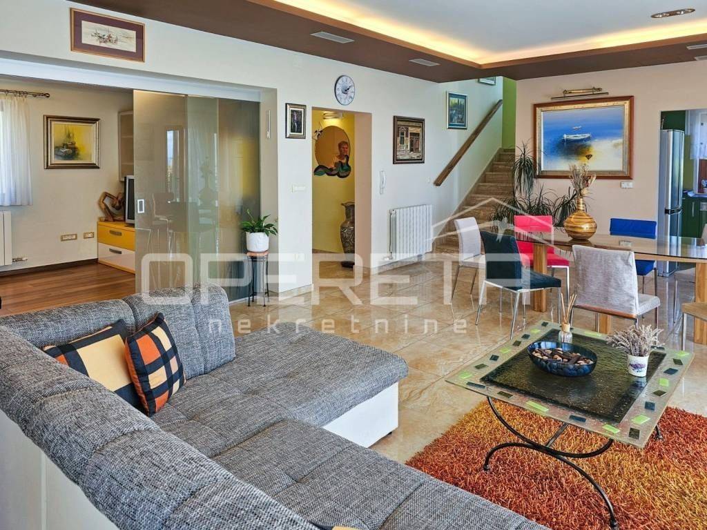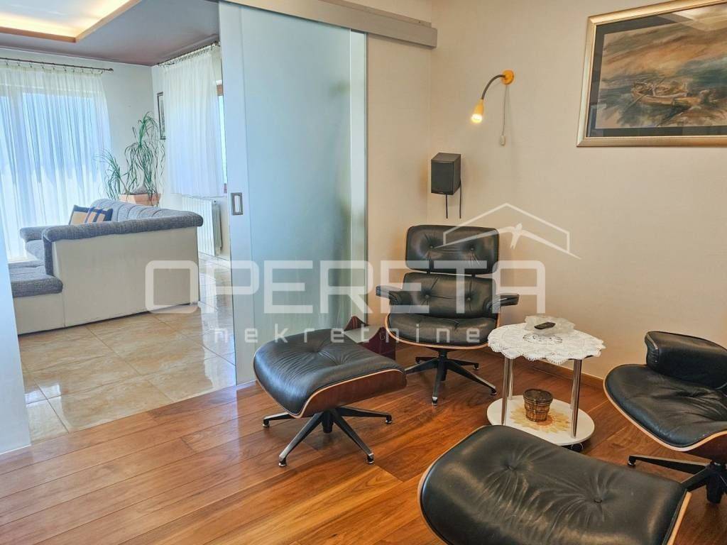 Next to the living room is a TV lounge with a floor made of American cherry wood, crafted by the renowned Croatian company Požgaj – giving the space a luxurious and cozy touch.
