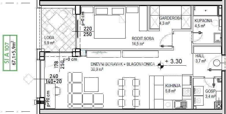 Prodaje se stan površine 67,1 m2 s lođom površine 5,9 m2 na 1. katu niskoenergetske stambeno – poslovne zgrade na odličnoj lokaciji. Zgrada se sastoji od podruma, visokog prizemlja, prvog, drugog i trećeg kata te sadrži ukupno 74 stambene jedinice i 7 poslovnih prostora. Završetak gradnje predviđen je krajem 2025./početak 2026. Energetski razred je A+. Moguć je odabir podnih obloga (keramika, parket ili laminat) te odabir unutarnje stolarije. Uz stan moguća je kupovina i vanjskog parkirnog mjesta po cijeni od 8.000,00 EUR, garažnog mjesta bez spremišta po cijeni od 14.000,00 EUR, garažnog mjesta sa spremištem do 17,4 m2 po cijeni od 17.500,00 EUR, garažnog mjesta sa spremištem do 19,4 m2 po cijeni od 19.500,00 EUR ili garažnog mjesta sa spremištem do 20,6 m2 po cijeni od 22.500,00 EUR.