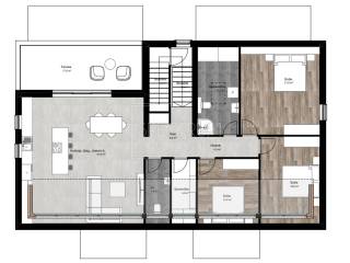 L'appartamento si estende sull'intero 2° piano di un piccolo edificio residenziale con 5 unità abitative. L'appartamento ha una superficie di 143,35 m2. L'appartamento è composto da un soggiorno con cucina open space e sala da pranzo, 3 camere da letto, bagno, wc, ripostiglio, disimpegno e terrazza. L'ampia terrazza di 17 m² è accessibile dal soggiorno e offre una vista aperta sulla natura. La disposizione delle stanze e le dimensioni dell'appartamento sono tali da garantire un vero comfort.