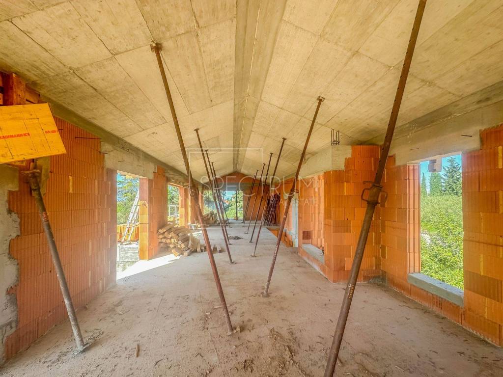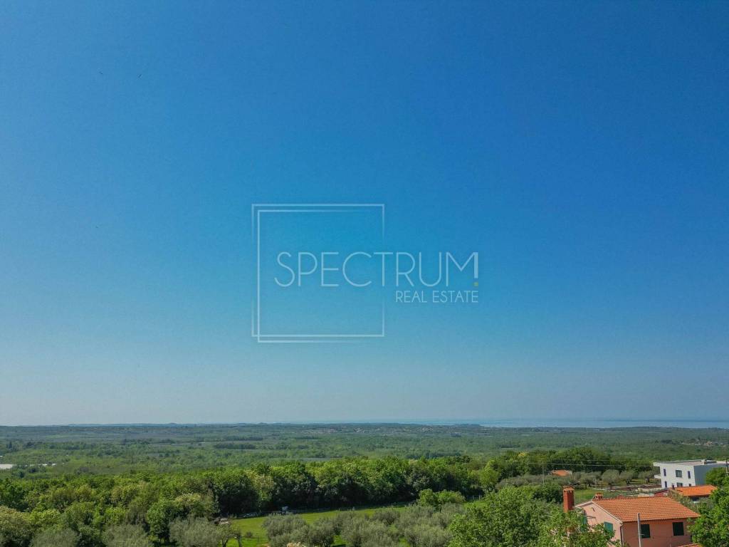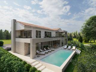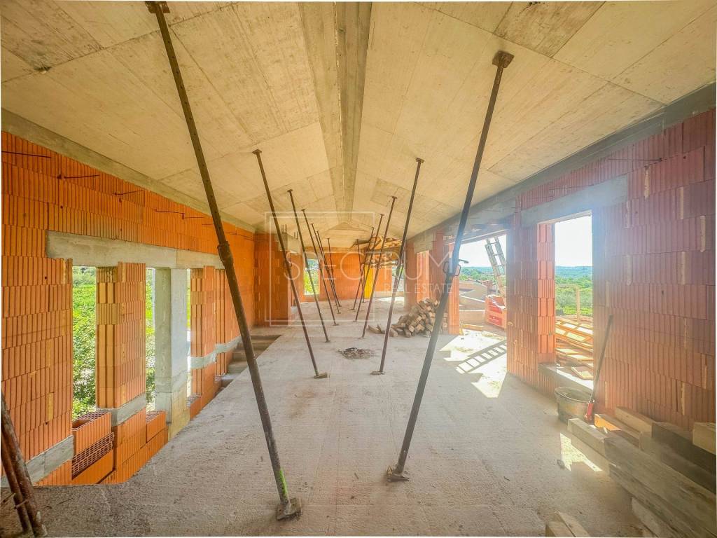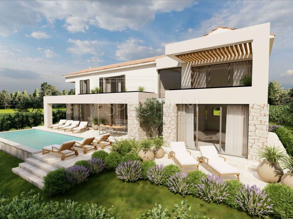 La villa indipendente si estende su piano terra e primo piano. La superficie della villa è di 256,78 m2. Al piano terra si trovano il soggiorno, la cucina con sala da pranzo, una camera da letto con il proprio bagno, un wc, una lavanderia, un corridoio e un locale tecnico. Dal soggiorno, dalla cucina e dal corridoio si accede ad un ampio terrazzo coperto dove si trova anche una cucina estiva. La terrazza è ideale per socializzare e godersi i caldi mesi estivi. Tramite una scala si accede al primo piano dove si trovano un disimpegno, 3 camere da letto, 3 bagni, uno studio ed un terrazzo coperto ed uno scoperto. Da una camera da letto si accede al terrazzo coperto, mentre le altre due camere hanno accesso al terrazzo scoperto. Tutte le terrazze offrono una vista sullo splendido paesaggio istriano e sul mare.