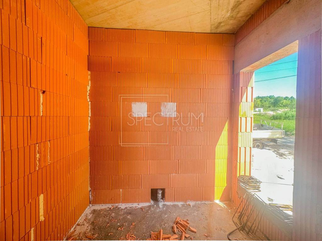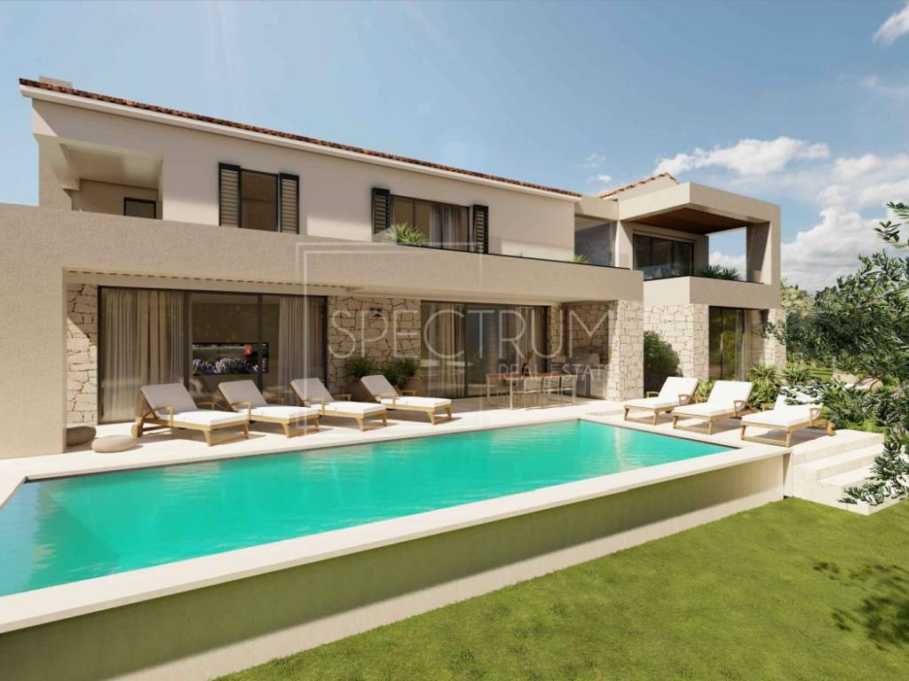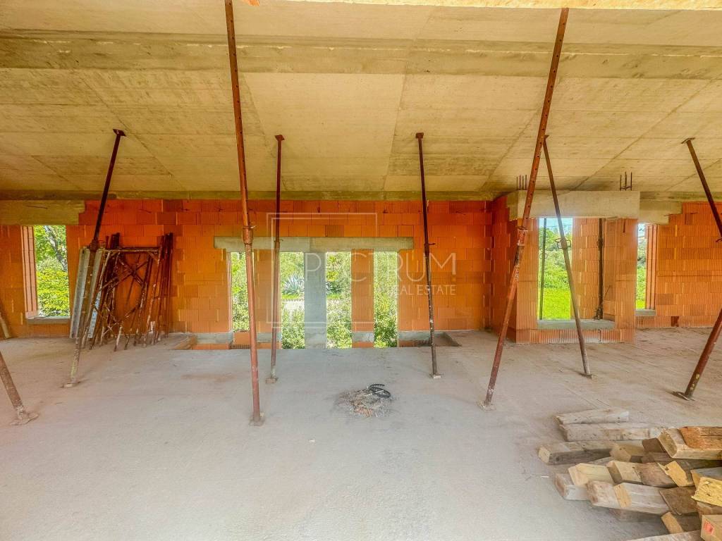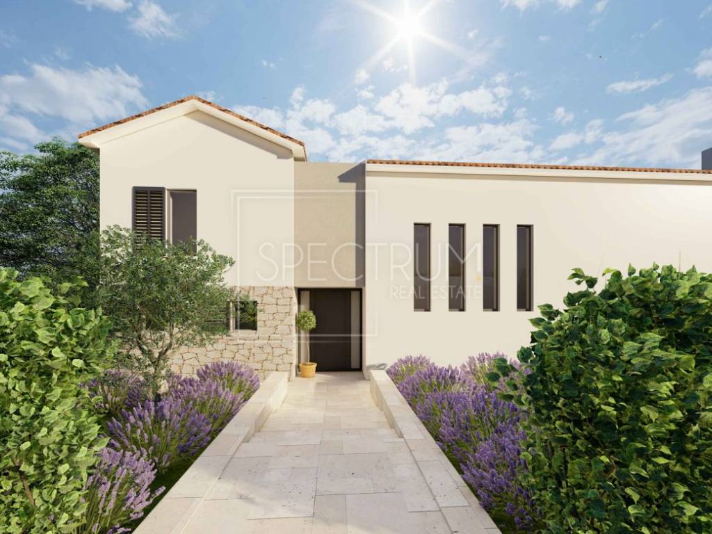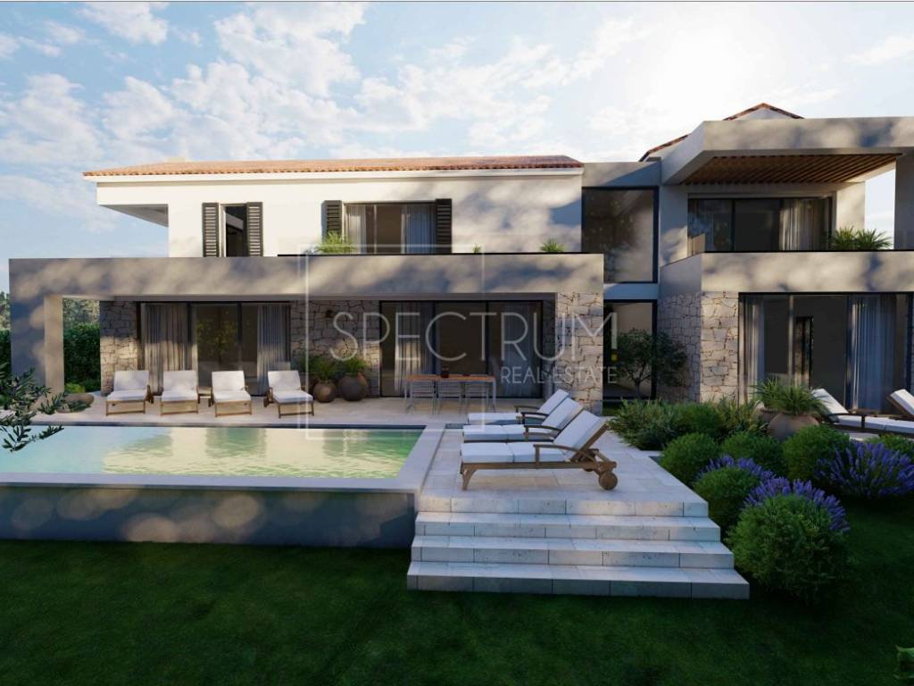 La villa indipendente si estende su piano terra e primo piano. La superficie della villa è di 256,78 m2. Al piano terra si trovano il soggiorno, la cucina con sala da pranzo, una camera da letto con il proprio bagno, un wc, una lavanderia, un corridoio e un locale tecnico. Dal soggiorno, dalla cucina e dal corridoio si accede ad un ampio terrazzo coperto dove si trova anche una cucina estiva. La terrazza è ideale per socializzare e godersi i caldi mesi estivi. Tramite una scala si accede al primo piano dove si trovano un disimpegno, 3 camere da letto, 3 bagni, uno studio ed un terrazzo coperto ed uno scoperto. Da una camera da letto si accede al terrazzo coperto, mentre le altre due camere hanno accesso al terrazzo scoperto. Tutte le terrazze offrono una vista sullo splendido paesaggio istriano e sul mare.