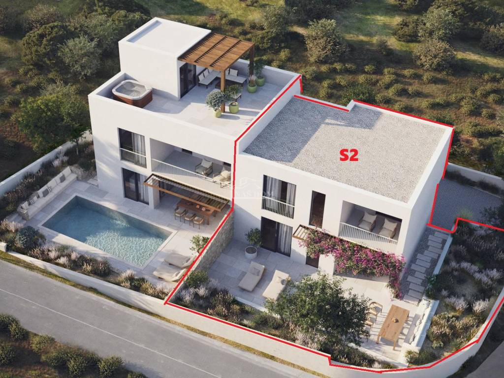 Casa S1 superficie netta utile 186,78 m2 è composta da tre piani: piano terra + primo piano + secondo piano. Il piano terra è composto da ingresso coperto, ingresso, WC, ripostiglio, cucina, sala da pranzo e soggiorno con uscita sulla terrazza coperta. Tramite scala interna si accede al piano superiore che comprende corridoio, bagno, due camere da letto, camera matrimoniale con bagno privato e terrazza coperta. L’ultimo piano dell’edificio è composto da corridoio, WC e terrazza scoperta di 67,72 m2. = 550.000,00 €