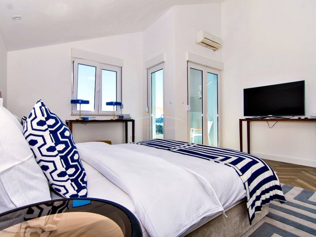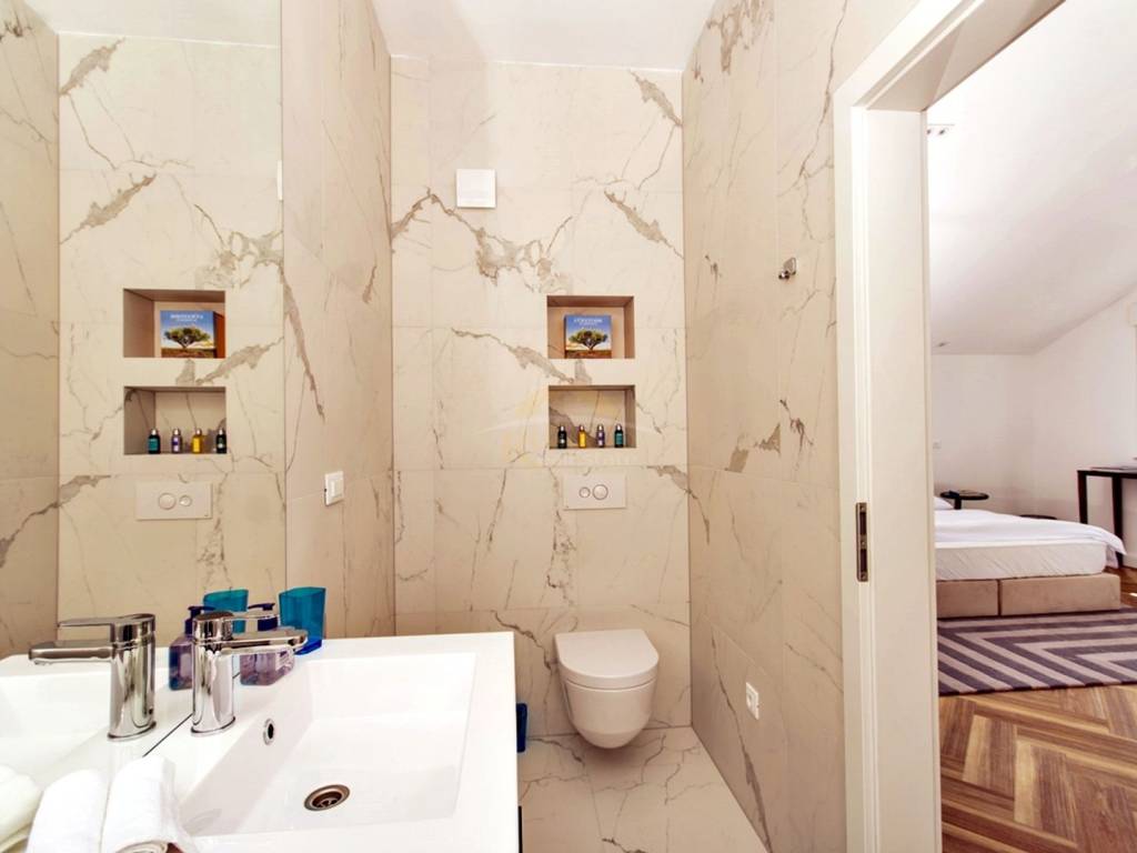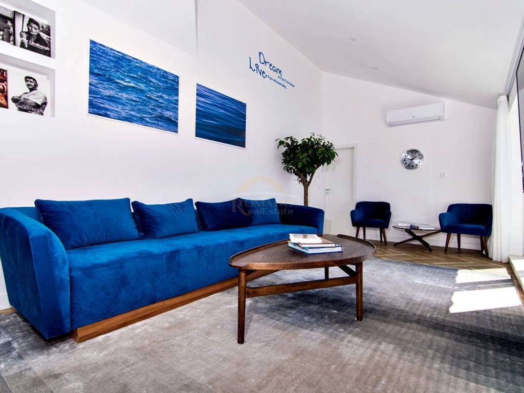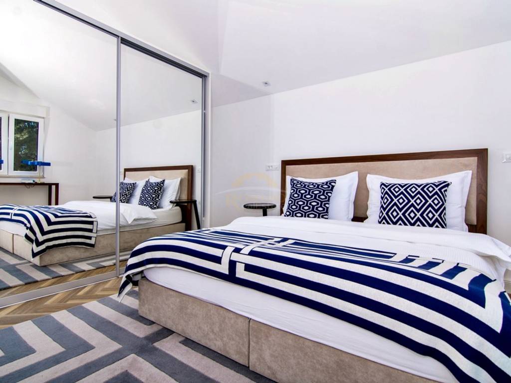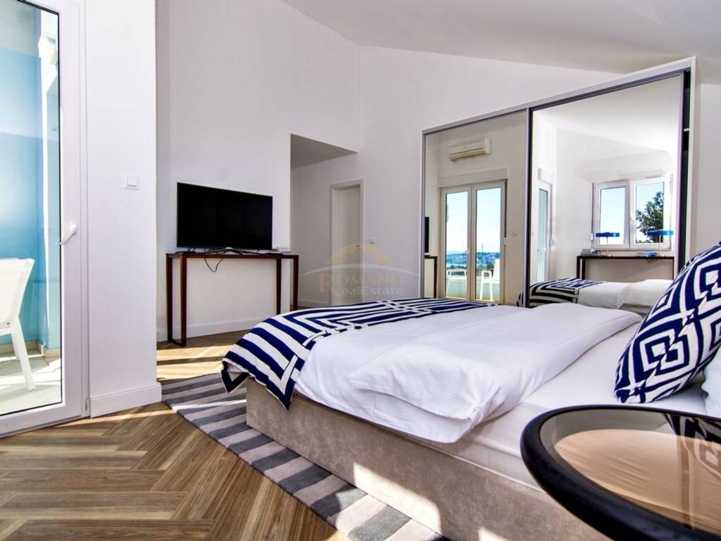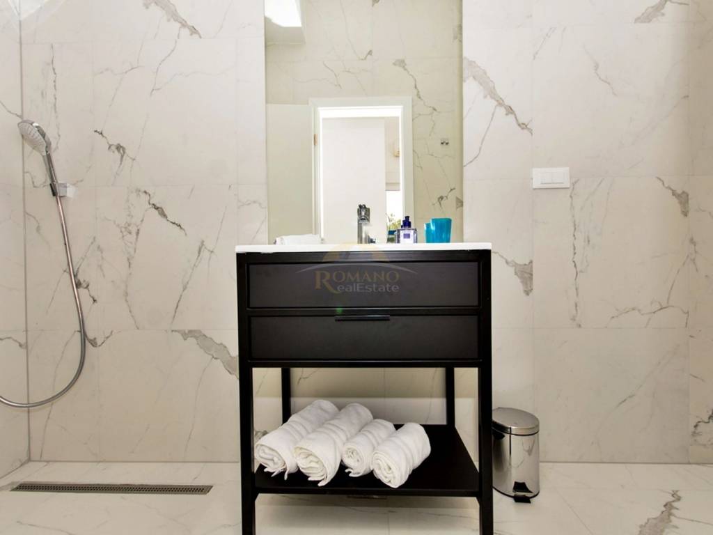 The lower floor offers a spacious living room in an open style, bathed in light, and three elegantly decorated bedrooms, each with its own bathroom. On the upper floor there are two more luxurious bedrooms with private bathrooms.