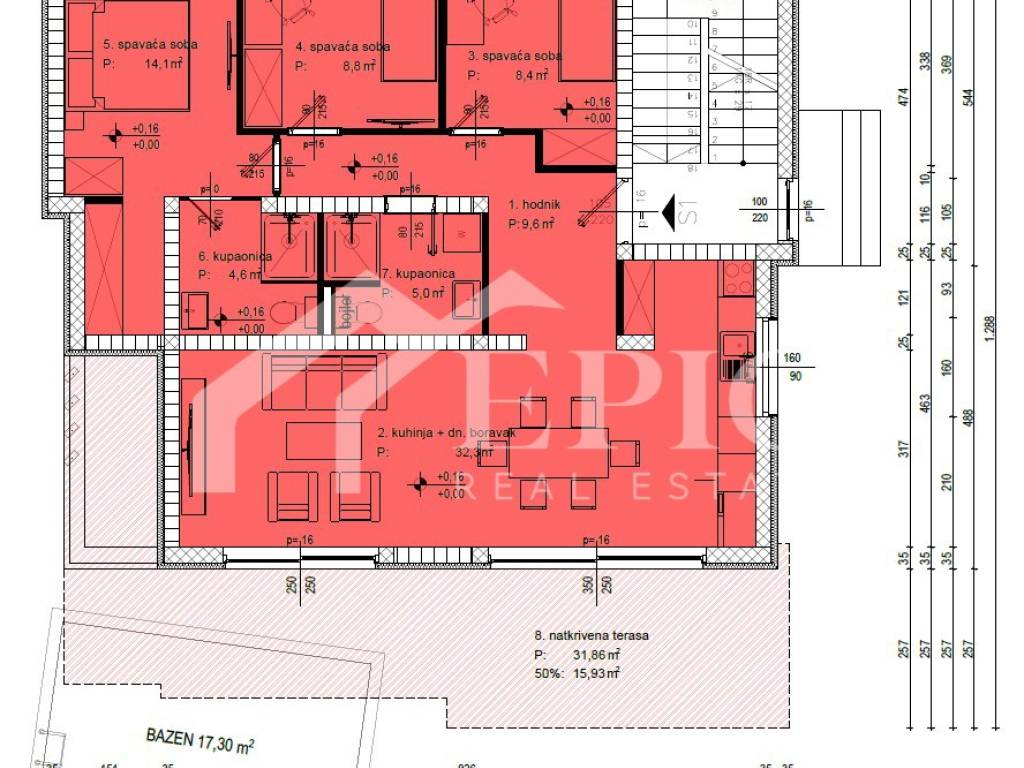 La zona centrale dell'appartamento è costituita da un ampio spazio aperto che unisce cucina, sala da pranzo e soggiorno, per una superficie totale di 32,30 m2. Questo ambiente è progettato per incontri sociali e momenti in famiglia, offrendo l'ambiente ideale per cucinare, pranzare e rilassarsi insieme. Dal soggiorno si accede a una terrazza coperta di 31,86 m2, perfetta per godersi l'aria aperta in ogni stagione dell'anno.