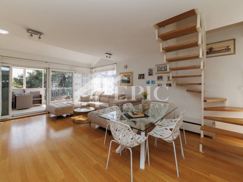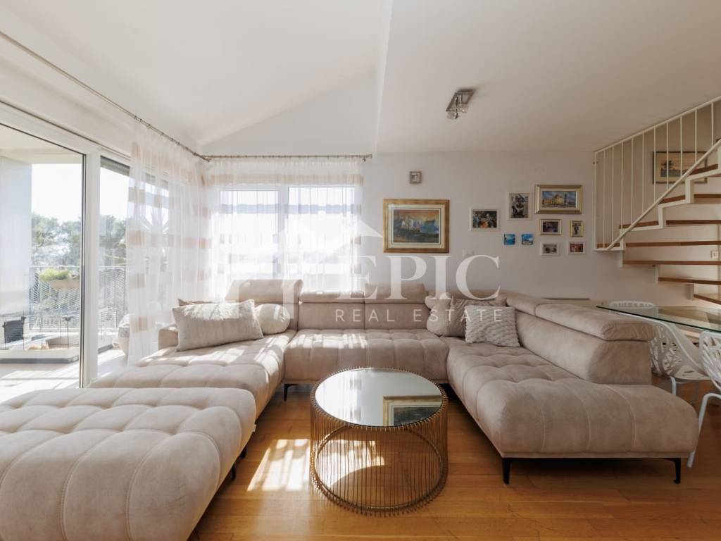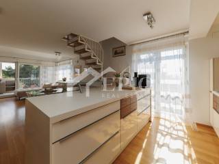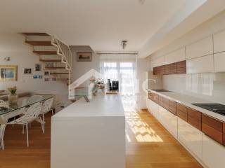 Questo appartamento arredato con gusto si sviluppa su una superficie utile di 95,91 m2 su due livelli, ed è composto da ingresso, bagno, due camere da letto e un soggiorno open space con cucina, sala da pranzo e soggiorno dal quale si accede a un loggiato orientato a sud-est con vista sul mare. All'appartamento appartengono anche due posti auto esterni.