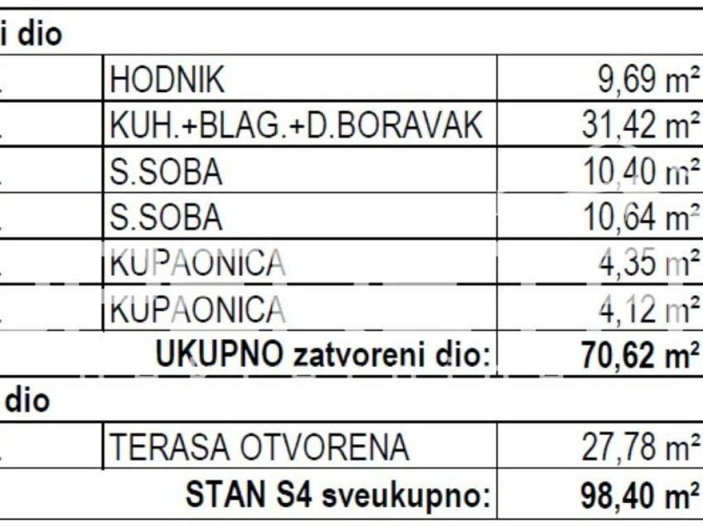 Stan S04 ima bruto površinu 113,56 m2 (98,40 m2 stan; 2,66 m2 spremište; 12,5 m2 vanjsko parkirno mjesto).