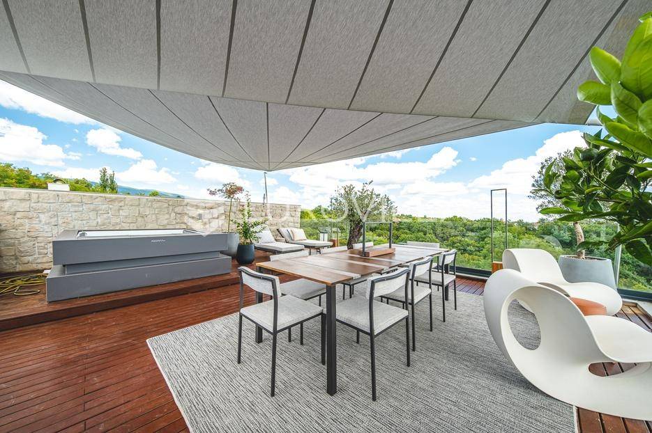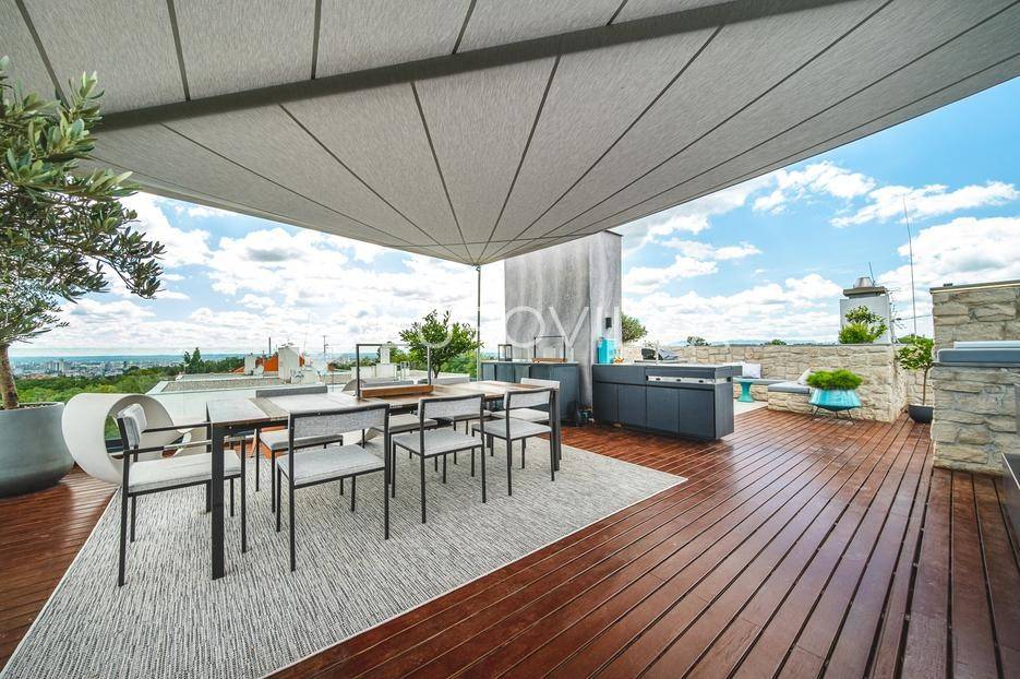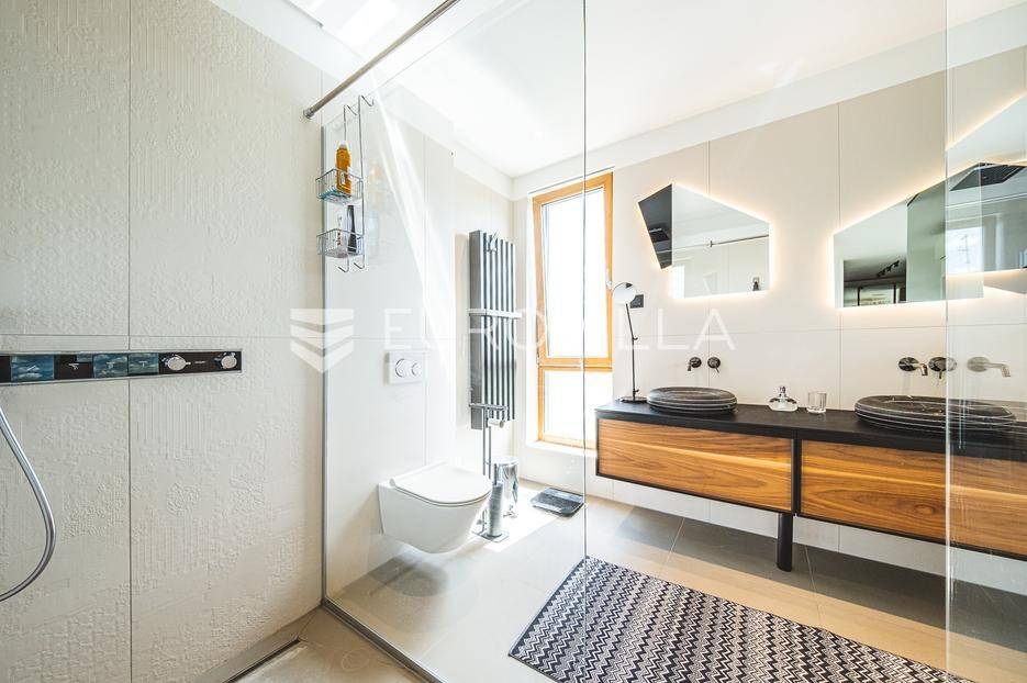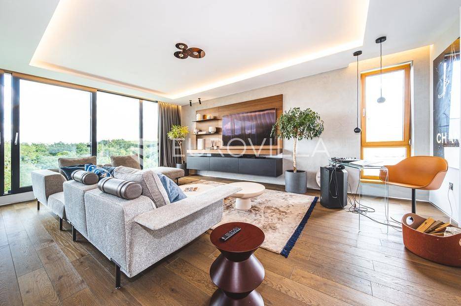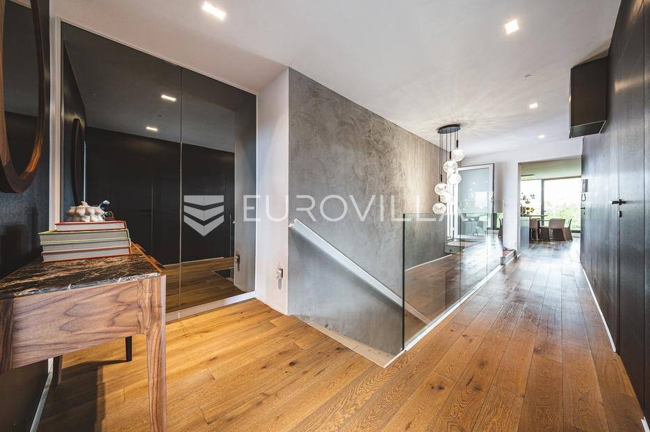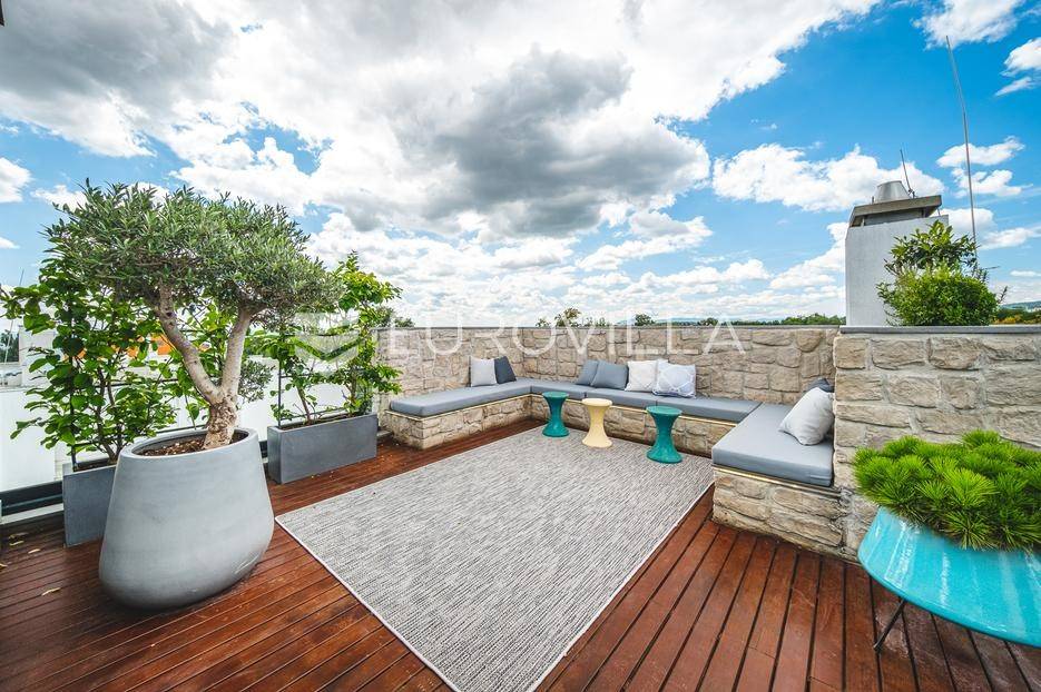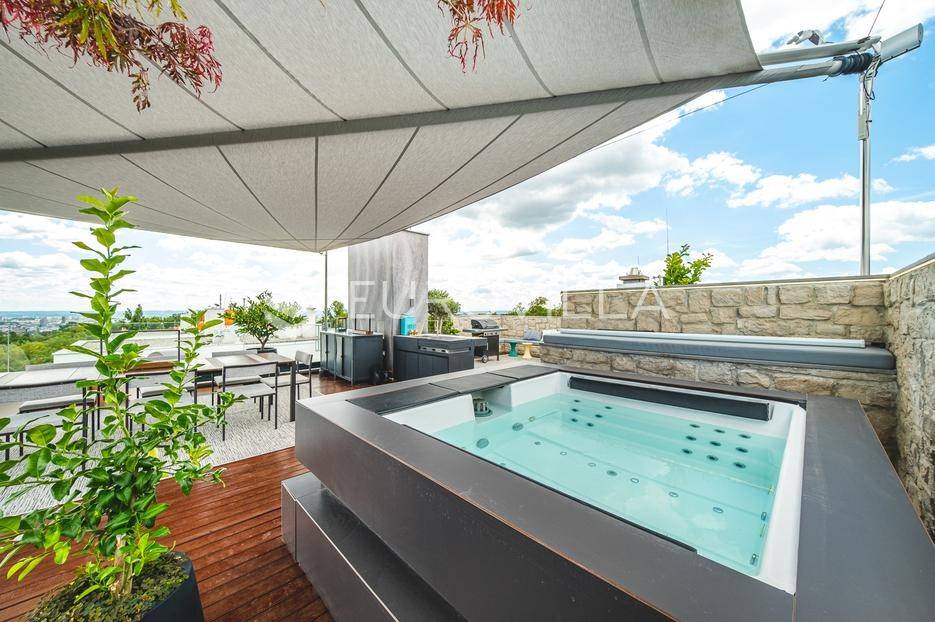 Na jednoj od najmirnijih i najpoželjnijih zagrebačkih lokacija, Jelenovcu, u ponudi je ekskluzivni trosobni penthouse smješten na drugom katu urbane vile novije gradnje.Stan se prostire na dvije etaže, ulazni hodnik smješten je na prvom katu, a unutarnje stubište vodi na glavnu etažu zatvorene površine 147,15 m2 koje obuhvaća, prostrani dnevni boravak, kuhinju i blagovaonicu u otvorenom konceptu s predivnim pogledom na park-šumu Jelenovac, glavne spavaće sobe (master room) s vlastitom kupaonicom i garderobom, radne sobe, dodatne spavaće sobe s vlastitom kupaonicom, zasebnog WC-a i odvojenog prostora za vešeraj.Pripada mu vanjski vrt površine 278,05 m2 (27,80), garaža površine 15,30 m2 (9,18), vanjsko parkirno mjesto 12,5 m2 (2,5) ukupno obračunski NKP 186,62 m2. Također raspolaže vlastitim, zasebno odvojenim spremištem smještenim u podrumu zgrade površine 18 m2.Stan je opremljen vrhunskim dizajnerskim namještajem i opremom: Antonio Lupi oprema u glavnoj kupaonici, Molteni garnitura za dnevni boravak, kuhinja The Cut (Italija) s Miele aparatima i vinskim hladnjakom Liebherr, dizajnerski lusteri i walk-in ormar talijanskog dizajna, parket i keramika I klase iz Italije.Posebnost stana je luksuzna terasa površine 70 m2 opremljena vrhunskim Talenti vrtnim namještajem, velikim blagovaonskim stolom za 12 osoba, vanjskom kuhinjom, električno podesivom tendom u obliku jedra koja prekriva cijelu površinu, jacuzzijem za četiri osobe te spektakularnim pogledom koji pruža potpuni ugođaj privatnosti i uživanja.Lokacija: