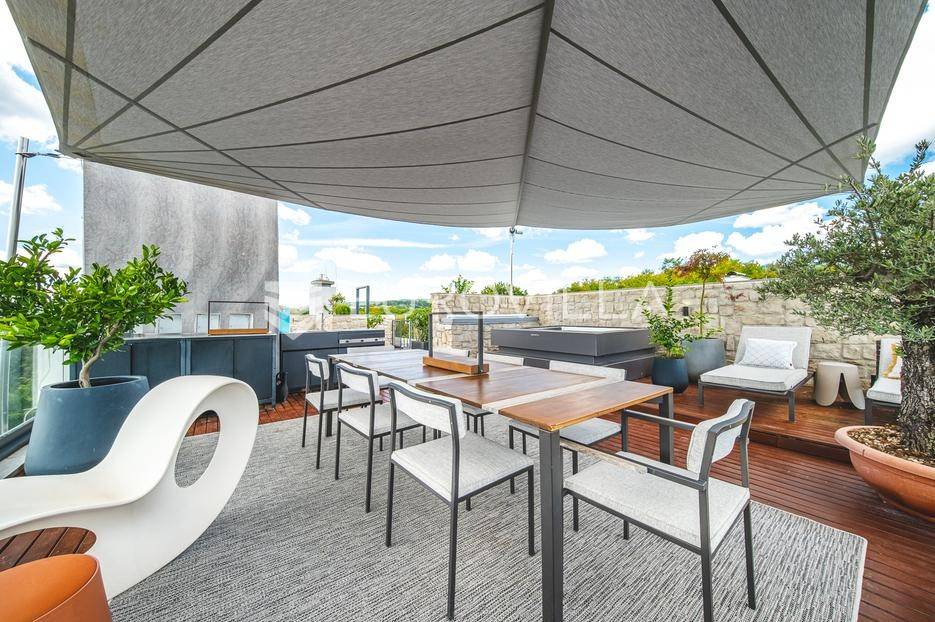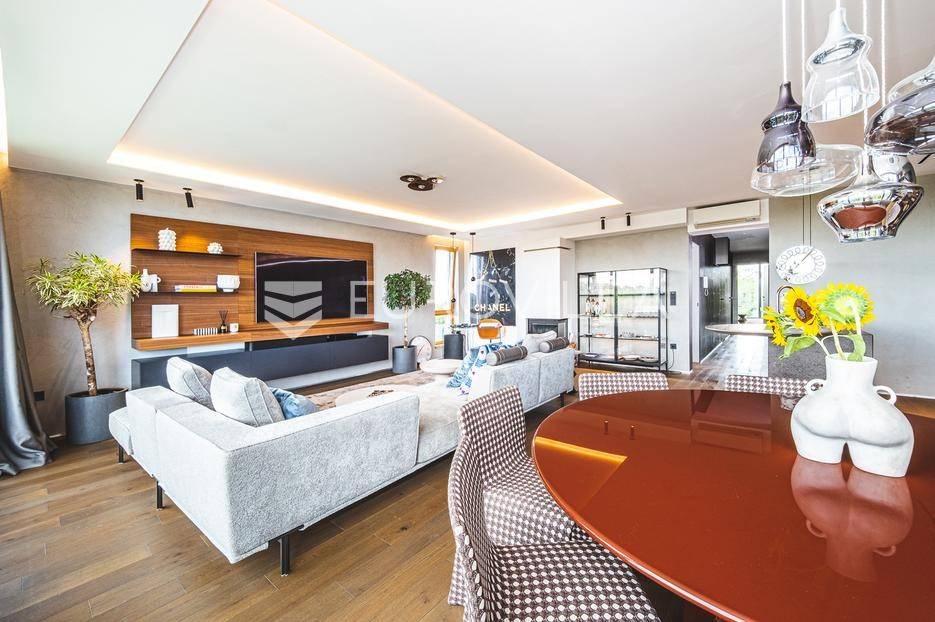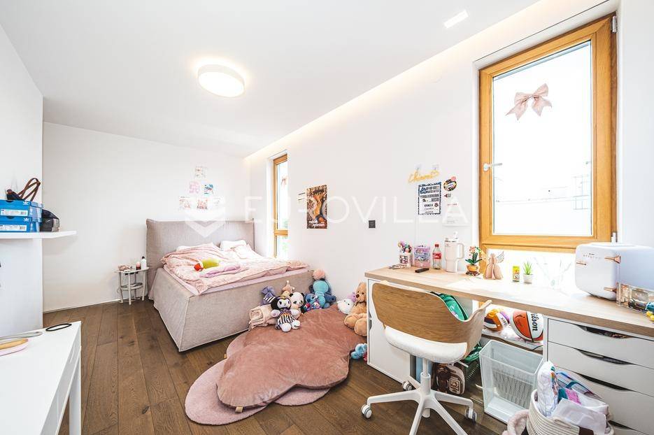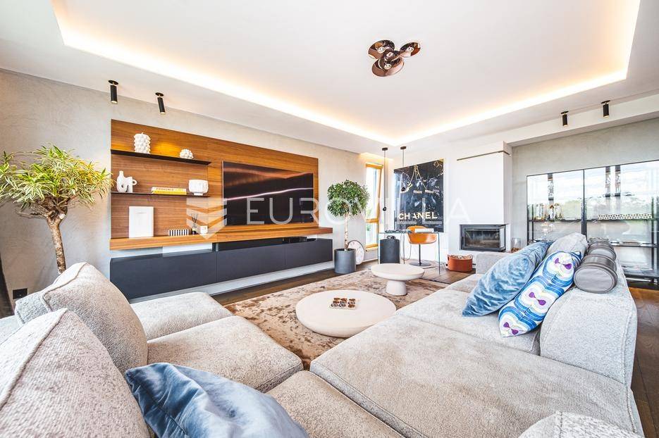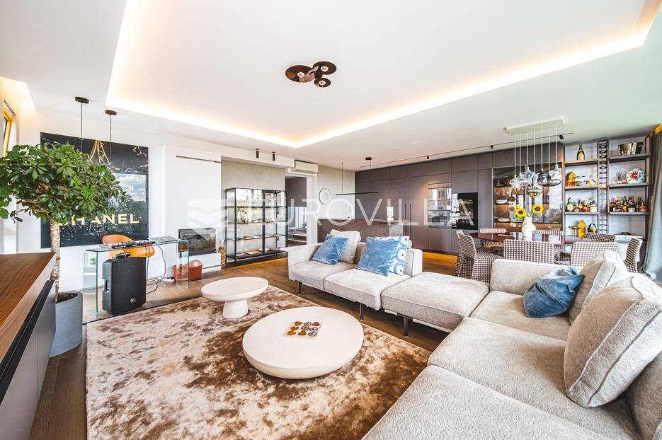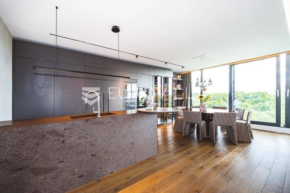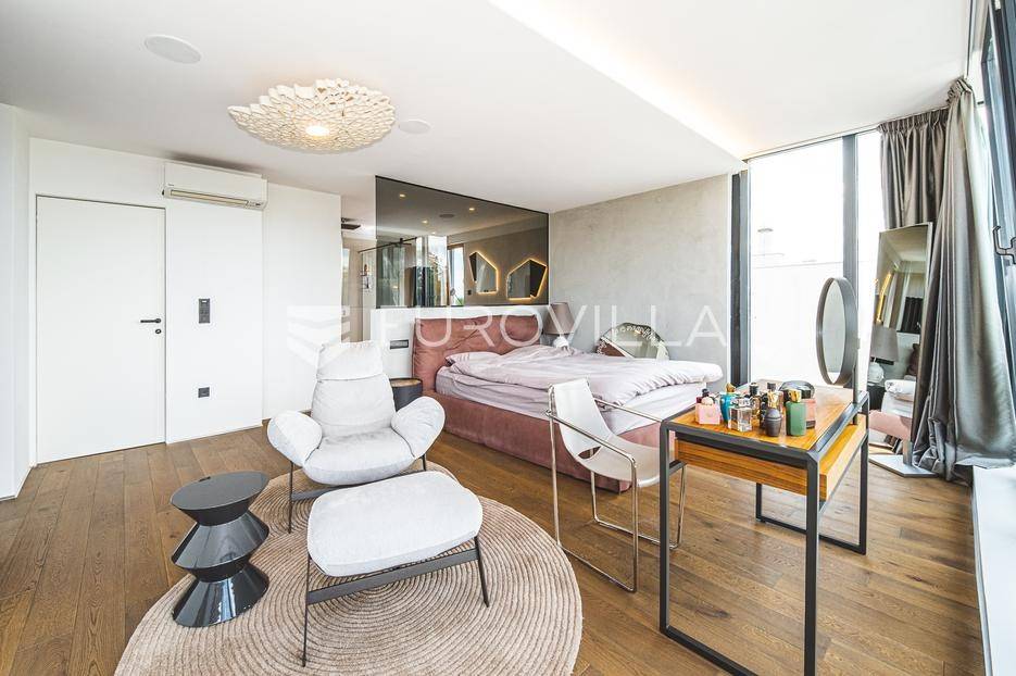 Na jednoj od najmirnijih i najpoželjnijih zagrebačkih lokacija, Jelenovcu, u ponudi je ekskluzivni trosobni penthouse smješten na drugom katu urbane vile novije gradnje.Stan se prostire na dvije etaže, ulazni hodnik smješten je na prvom katu, a unutarnje stubište vodi na glavnu etažu zatvorene površine 147,15 m2 koje obuhvaća, prostrani dnevni boravak, kuhinju i blagovaonicu u otvorenom konceptu s predivnim pogledom na park-šumu Jelenovac, glavne spavaće sobe (master room) s vlastitom kupaonicom i garderobom, radne sobe, dodatne spavaće sobe s vlastitom kupaonicom, zasebnog WC-a i odvojenog prostora za vešeraj.Pripada mu vanjski vrt površine 278,05 m2 (27,80), garaža površine 15,30 m2 (9,18), vanjsko parkirno mjesto 12,5 m2 (2,5) ukupno obračunski NKP 186,62 m2. Također raspolaže vlastitim, zasebno odvojenim spremištem smještenim u podrumu zgrade površine 18 m2.Stan je opremljen vrhunskim dizajnerskim namještajem i opremom: Antonio Lupi oprema u glavnoj kupaonici, Molteni garnitura za dnevni boravak, kuhinja The Cut (Italija) s Miele aparatima i vinskim hladnjakom Liebherr, dizajnerski lusteri i walk-in ormar talijanskog dizajna, parket i keramika I klase iz Italije.Posebnost stana je luksuzna terasa površine 70 m2 opremljena vrhunskim Talenti vrtnim namještajem, velikim blagovaonskim stolom za 12 osoba, vanjskom kuhinjom, električno podesivom tendom u obliku jedra koja prekriva cijelu površinu, jacuzzijem za četiri osobe te spektakularnim pogledom koji pruža potpuni ugođaj privatnosti i uživanja.Lokacija: