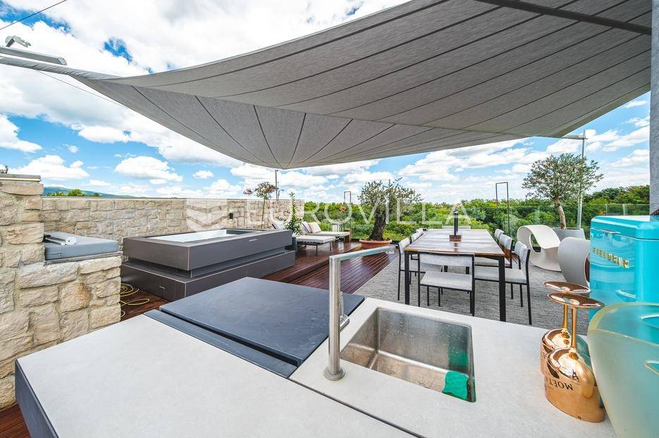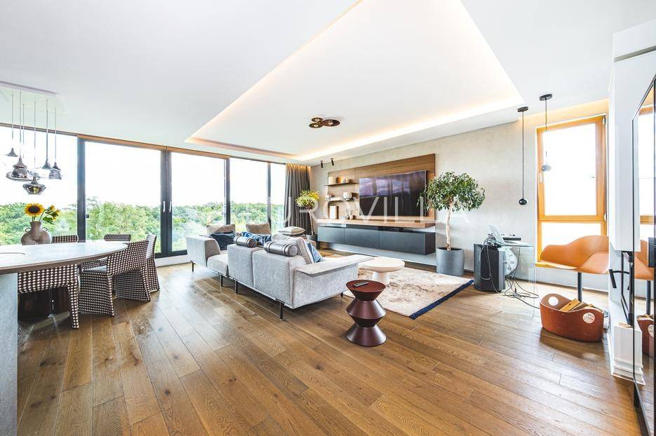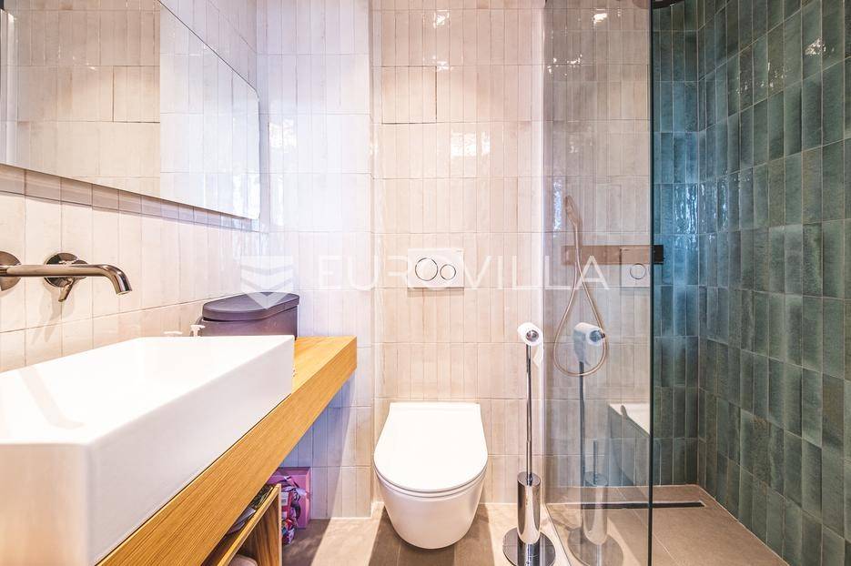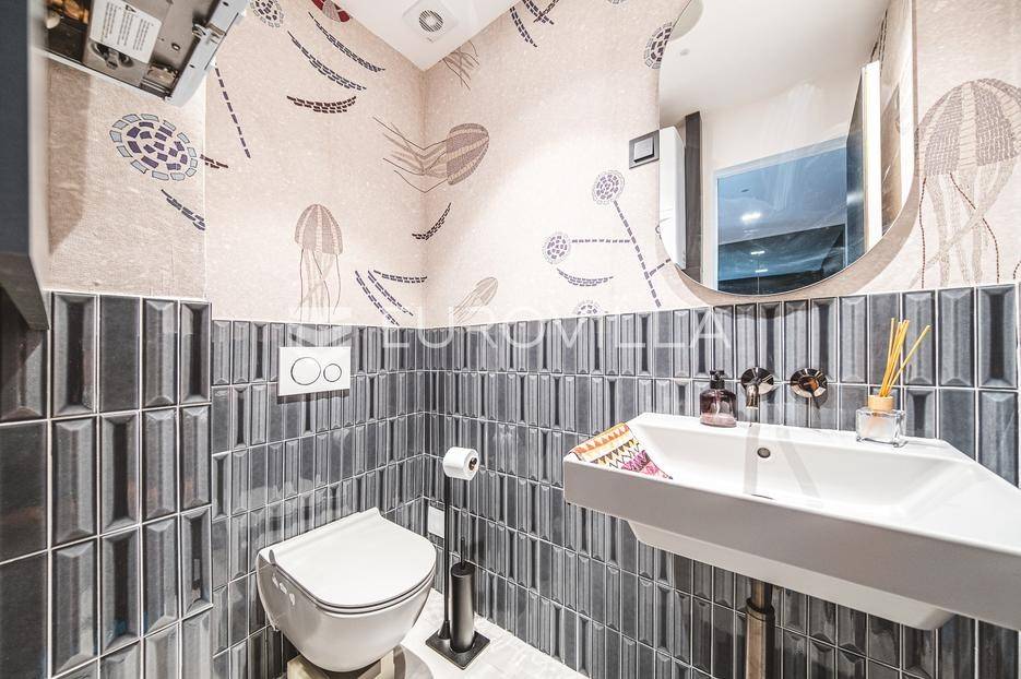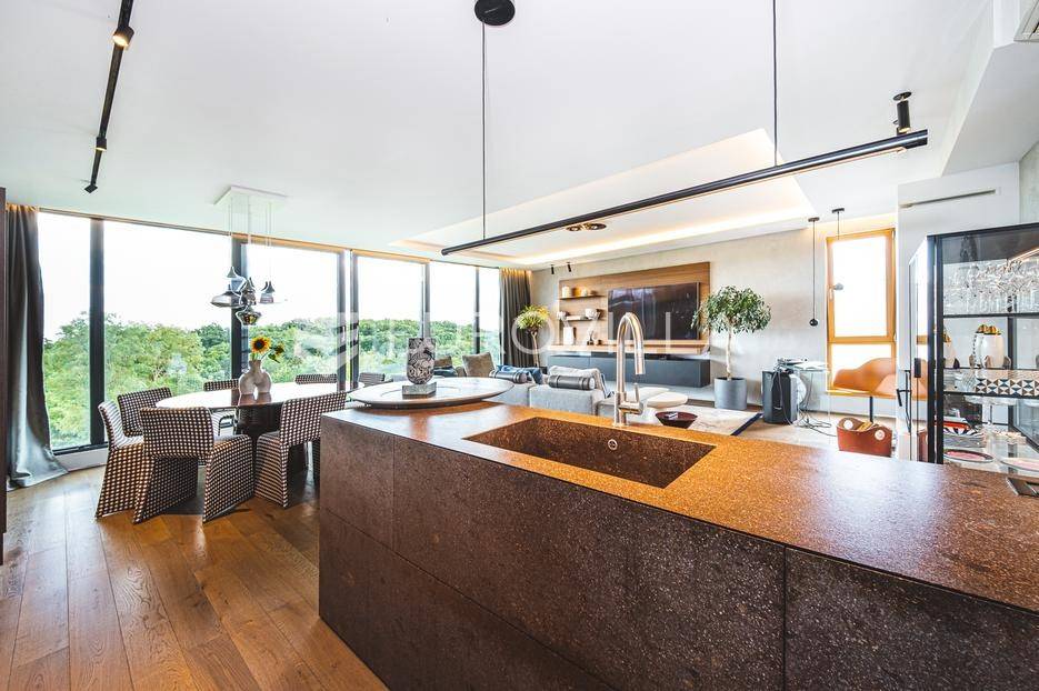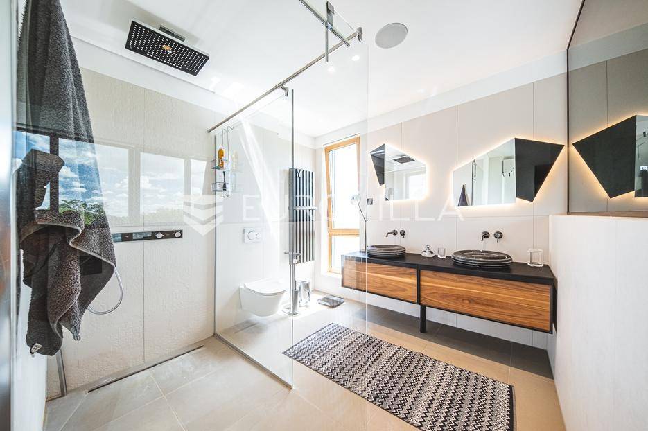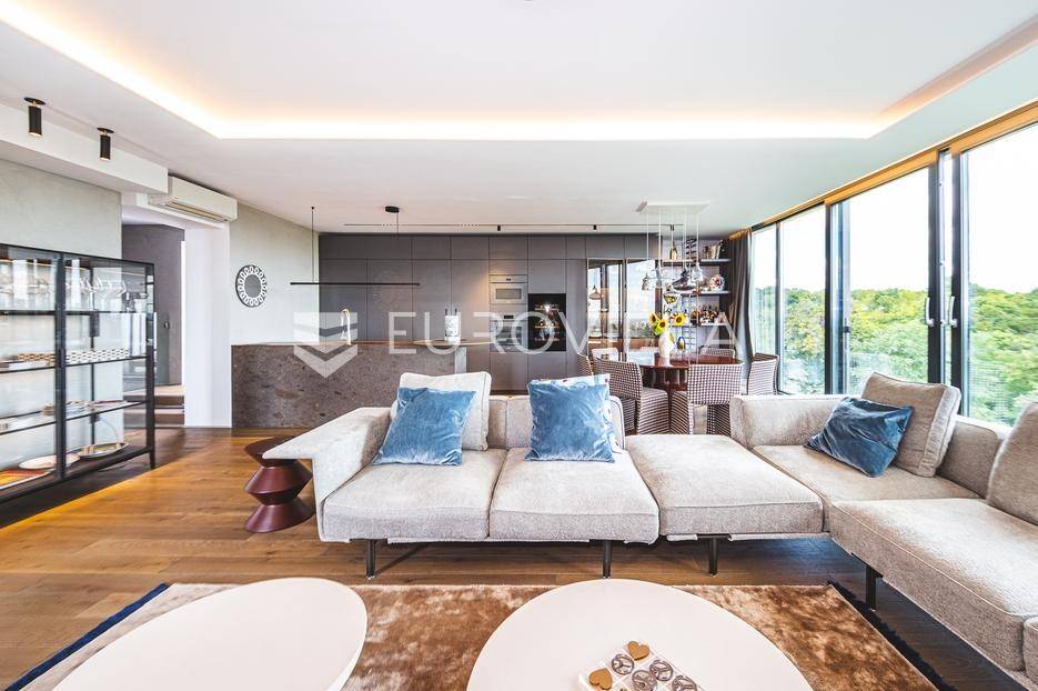 Na jednoj od najmirnijih i najpoželjnijih zagrebačkih lokacija, Jelenovcu, u ponudi je ekskluzivni trosobni penthouse smješten na drugom katu urbane vile novije gradnje.Stan se prostire na dvije etaže, ulazni hodnik smješten je na prvom katu, a unutarnje stubište vodi na glavnu etažu zatvorene površine 147,15 m2 koje obuhvaća, prostrani dnevni boravak, kuhinju i blagovaonicu u otvorenom konceptu s predivnim pogledom na park-šumu Jelenovac, glavne spavaće sobe (master room) s vlastitom kupaonicom i garderobom, radne sobe, dodatne spavaće sobe s vlastitom kupaonicom, zasebnog WC-a i odvojenog prostora za vešeraj.Pripada mu vanjski vrt površine 278,05 m2 (27,80), garaža površine 15,30 m2 (9,18), vanjsko parkirno mjesto 12,5 m2 (2,5) ukupno obračunski NKP 186,62 m2. Također raspolaže vlastitim, zasebno odvojenim spremištem smještenim u podrumu zgrade površine 18 m2.Stan je opremljen vrhunskim dizajnerskim namještajem i opremom: Antonio Lupi oprema u glavnoj kupaonici, Molteni garnitura za dnevni boravak, kuhinja The Cut (Italija) s Miele aparatima i vinskim hladnjakom Liebherr, dizajnerski lusteri i walk-in ormar talijanskog dizajna, parket i keramika I klase iz Italije.Posebnost stana je luksuzna terasa površine 70 m2 opremljena vrhunskim Talenti vrtnim namještajem, velikim blagovaonskim stolom za 12 osoba, vanjskom kuhinjom, električno podesivom tendom u obliku jedra koja prekriva cijelu površinu, jacuzzijem za četiri osobe te spektakularnim pogledom koji pruža potpuni ugođaj privatnosti i uživanja.Lokacija: