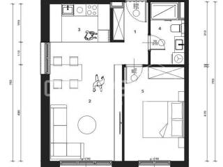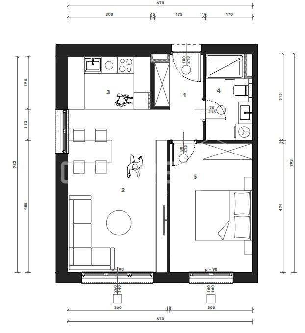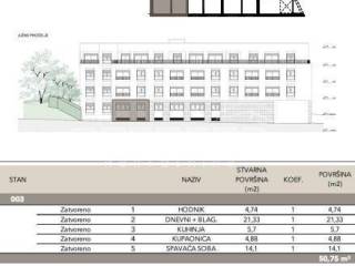 Sastoji se od ulaznog hodnika, kuhinje s blagovaonicom i dnevnog boravka, spavaće sobe i kupaonice. Uz stan je potrebno kupiti garažno mjesto i spremište.