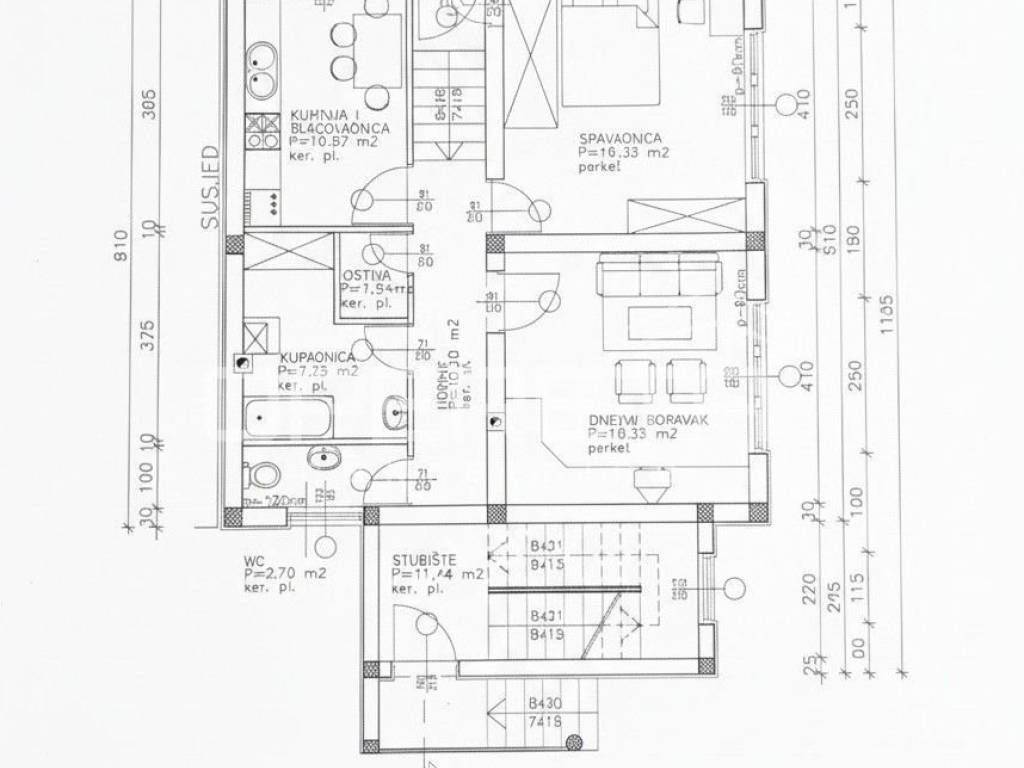 Na prodaju je stan ukupne obračunske površine 85,02 m2. Stan se sastoji od stambenog prostora veličine 62,73 m2, dva pripadajuća spremišta u podrumu (15,33 m2 i 15,03 m2) te vrta površine 71 m2. Stan je opremljen klimom. Uz stan dolazi i parkirno mjesto pod nadstrešnicom.