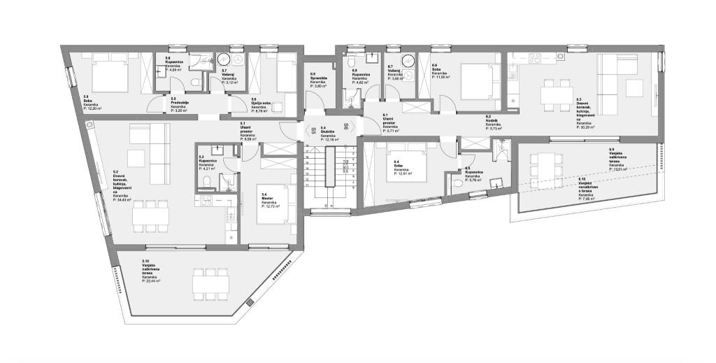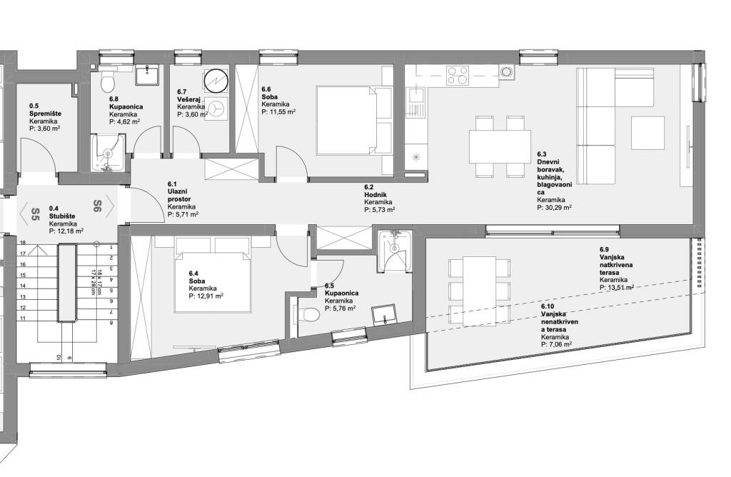L'appartamento S6 si trova al 2° piano dell'edificio ed ha una superficie abitabile interna di 80,33 m2 + 13,51 m2 di terrazza coperta + 7,06 m2 di terrazza scoperta. È composto da 2 camere da letto, soggiorno open space, cucina e sala da pranzo, 2 bagni con WC, lavanderia, ingresso e terrazza. All'appartamento appartiene anche un posto auto esterno (incluso nel prezzo). La superficie commerciale / di vendita totale dell'appartamento è di 88,85 m2 (la parte coperta della terrazza è conteggiata con coefficiente 0,5, quella scoperta con 0,25).