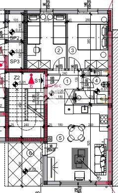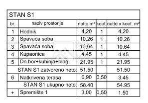 The apartment in question marked "S1" is located in building no. 21, on the ground floor, and consists of: hallway, living room + kitchen + dining room, 2 bedrooms, bathroom and covered terrace, total area 54.95 m2.