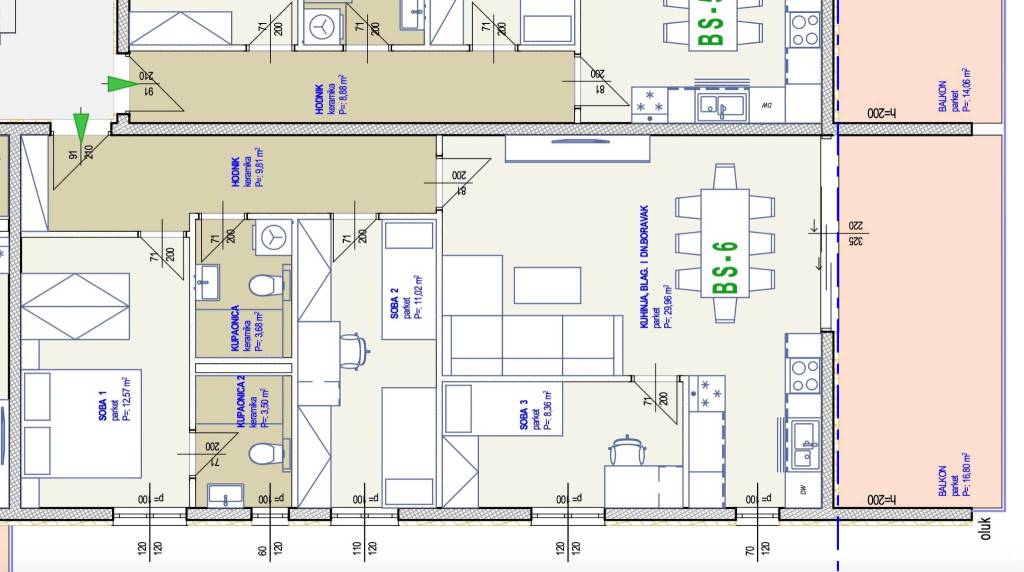 B-S6 Trogir- Seget Donji komforan trosoban stan od 95,70 m2 u novogradnji s garažom i liftom.Smješten na visokom prvom katu zgrade, a sastoji se od: komfornog dnevnoga boravka kuhinje i blagovaonice otvorenog tipa, hodnika, tri spavaće sobe, dvije kupaonice (master soba s vlastitom kupaonicom) i prostranog balkona naslonjene na stan.Zatvorena stambena površina 78,90 m2 te balkon 16,80 m2 naslonjena na dnevni boravak (jug).Uz stan obvezna je kupnja jednog garažnog parkirnog mjesta po cijeni 15.000 Eur.Orijentacija stana je jug- zapadPredviđeni završetak radova je 06/2026.g.Kvalitetna gradnja uz izvrsnu toplinsku izolaciju termo fasada, PVC zatvori podizno klizne stijenke, keramičke pločice i parket, podno grijanje u kupaonici, kompletno sanitarijama opremljena kupaonica. Instalacije za klimatizaciju u cijelom prostoru stana s multi-split sustavom.Za sve dodatne informacije stojim vam na raspolaganju.
