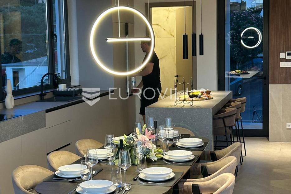 Murter, Slanica, luksuzna dizajnerska vila, savršeno pozicionirana uz predivnu plažu Slanica, nudi ekskluzivno iskustvo mediteranskog života.Sastoji se od četiri raskošne razine, istinskih oaza elegancije i udobnosti.SUTEREN: Zaronite u raskoš zabave i relaksacije u suterenu ove vile. Ovdje se nalaze prostorije za druženje i biljar, wellness oaza za potpuno opuštanje, prostrana teretana za održavanje kondicije, elegantno uređen WC te ljetna kuhinja s dodatnom prostorijom za nezaboravne trenutke na otvorenom. Uživajte u osvježenju u prekrasnom bazenu površine 44m2 ili pripremite gourmet obrok na roštilju, okruženi mirisima Mediterana.PRIZEMLJE: Ovo raskošno prizemlje nudi četiri velike spavaće sobe, svaka sa svojom ekskluzivnom kupaonicom. Prostrane, udobne i elegantno uređene, ove sobe pružaju privatnost i luksuzan odmor.PRVI KAT: Savršeno osmišljen "open space" koncept pruža prostor za uživanje u svakom trenutku. Velika moderna kuhinja, prostrani dnevni boravak i blagovaonica pretvaraju se u pozornicu za nezaboravne obroke i druženja. Uživajte u opuštanju na terasi ili se prepustite užicima u jacuzziju, dok vas očaravaju pogledi na more i otoke.KROVNA TERASA: Ova impozantna krovna terasa pruža spektakularne panoramske poglede na plažu Slanica i Kornate. Ovdje možete uživati u sunčevim zrakama danju ili romantičnim večerima pod zvijezdama.OGRANIČENO DVORIŠTE I VRT: Okružena ogradom, ova vila nudi privatnost i sigurnost. Održavan vrt s sustavom za navodnjavanje pruža oazu mira i ljepote.OSTALE POGODNOSTI: Tri natkrivena parking mjesta osiguravaju udobnost i praktičnost. Plaža udaljena samo 300 metara čini ovu vilu savršenim izborom za one koji žele uživati u kristalno čistom moru.Ova vila predstavlja izvanrednu priliku za život na najvišoj razini u jednom od najljepših dijelova Dalmacije. Iskoristite priliku i uživajte u luksuzu, udobnosti i ljepoti koje ova nekretnina nudi.Za sve dodatne informacije stojimo na raspolaganju.