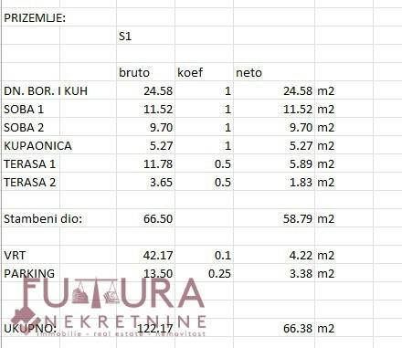 Sastoji se od: dvije spavaće sobe, dnevnog boravka + kuhinja + blagovaona, kupaonice i terase.
