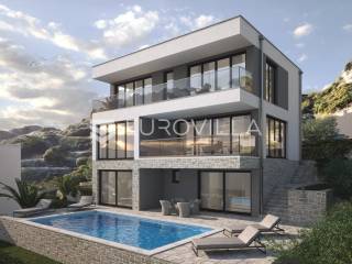 Pelješac, Orebić, ekluzivne, luksuzne vile na parcelema veličine cca 450 m2 na tri etaže ukupno NKP 207 m2.Suteren veličine NKP 71.83 m2 a sastoji se od spremišta, fitness centra, natkrivene terase,kupaonice, saune, jaccuzi,tehničkog dijela.Prizemlje veličine NKP 73.92 m2 a sastoji se od ulaznog hodnika, wc, kupaonice, sobe s garderobnim dijelom, natkrivenom terasom, dnevnog boravka s kuhinjom, kuhinja i stubišni dio.Prvi kat veličine NKP 62.14 m2 a sastoji se od pretsoblja, kupaonice, 2 garderobna dijela, dvije sobe, balkona, kupaonice.Svaka villa posjeduje grijani bazen, s privatnim parkirnim mjestom.Gradnja započinje krajem 2025 godine.Iz vile se pruža prekrasan pogled na more i obalu te otok Korčulu. Objekt će biti okružen privatnim vrtom s palmama i mediteranskim biljem koje jamči apsolutnu privatnost!