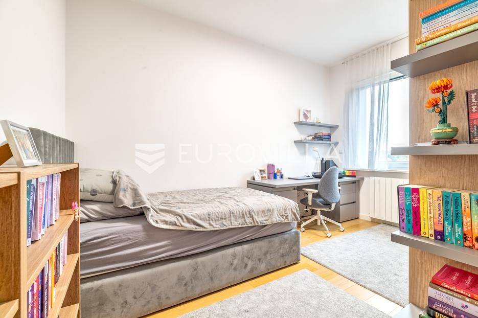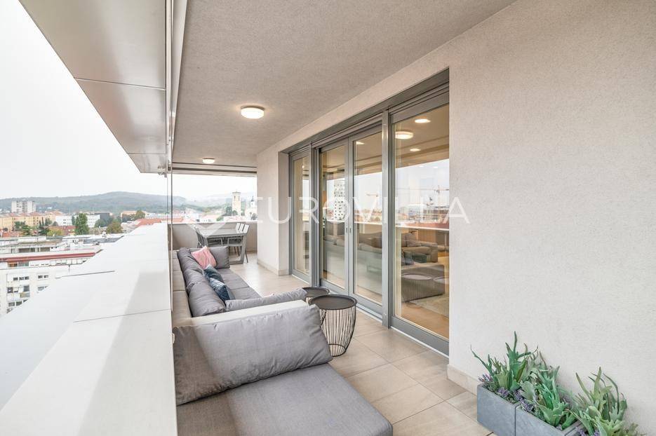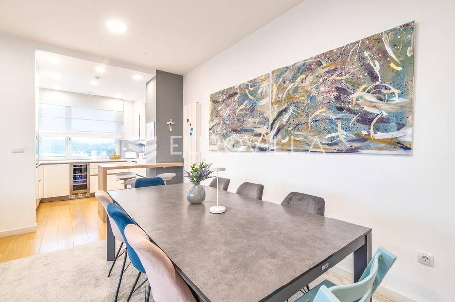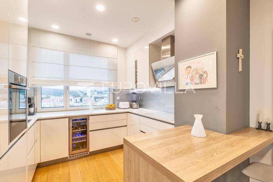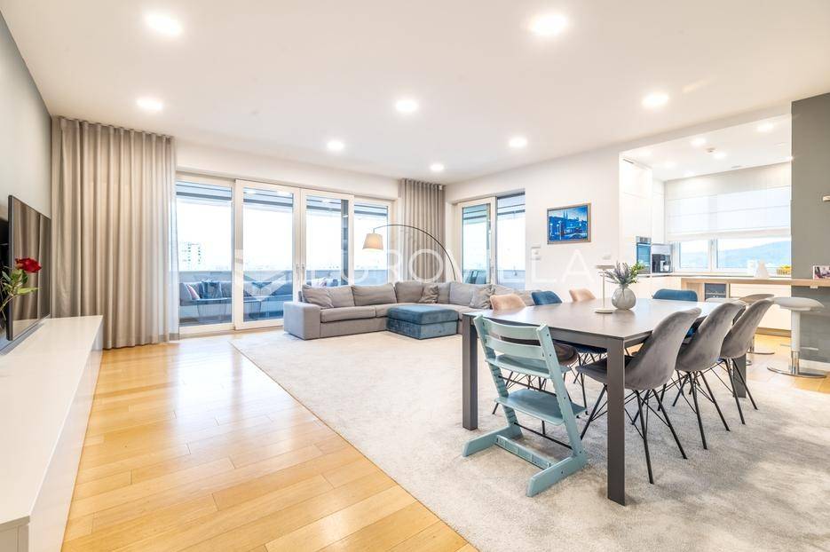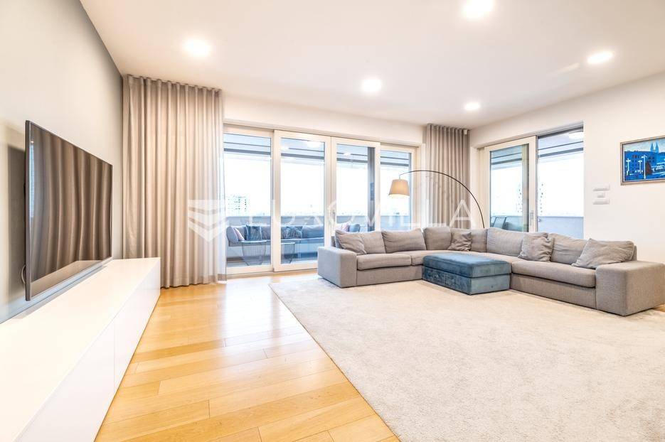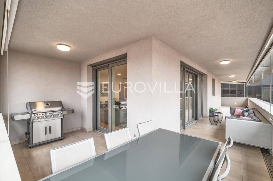 Zagreb, Črnomerec, VMD stambeno-poslovni kvart u ulici Kuniščak, luksuzan peterosoban stan u modernoj i kvalitetnoj novogradnji iz 2017. godine.Sastoji se od ulaznog hodnika, prostranog dnevnog boravka s kuhinjom i blagovaonicom površine 48 m2, koji izlazi na terasu, master spavaće sobe s walk in garderobom i kupaonicom s tušem, tri dječje sobe, druge kupaonice s kadom, vešeraja i gostinjskog toaleta.Dnevni boravak s kuhinjom i blagovaonicom je orijentiran na sunčanu južnu i zapadnu stranu, s otvorenim pogledom na grad, dok su spavaće sobe na istočnoj mirnoj strani odvojene od dnevnog dijela.Zatvorena površina stana iznosi 142,40 m2, natkrivena terasa 49,20 m2 (24,60 m2) te mu pripadaju dvije garaže površine 22,50 m2 (13,5 m2) i 22,40 m2 (13,44 m2). Ukupno obračunski NKP 194 m2.Kvalitetna oprema, podno grijanje u kupaonicama, hrastov parket, alu-drvo stolarija, komarnici, električni podizači roleta, dimni senzor, klimatizirane sve prostorije, centralni usisavač, centralni master prekidač, električne rolo tende preko cijele terase, izvrsna toplinska izolacija, alarm, video portafon. Stan je u potpunosti namješten i opremljen.Izvrsna lokacija, tramvaj zona, blizina centra, bolnica, dječji park ispred zgrade i odlična prometna povezanost s ostatkom grada.Za sve ostale informacije nas slobodno kontaktirajte.