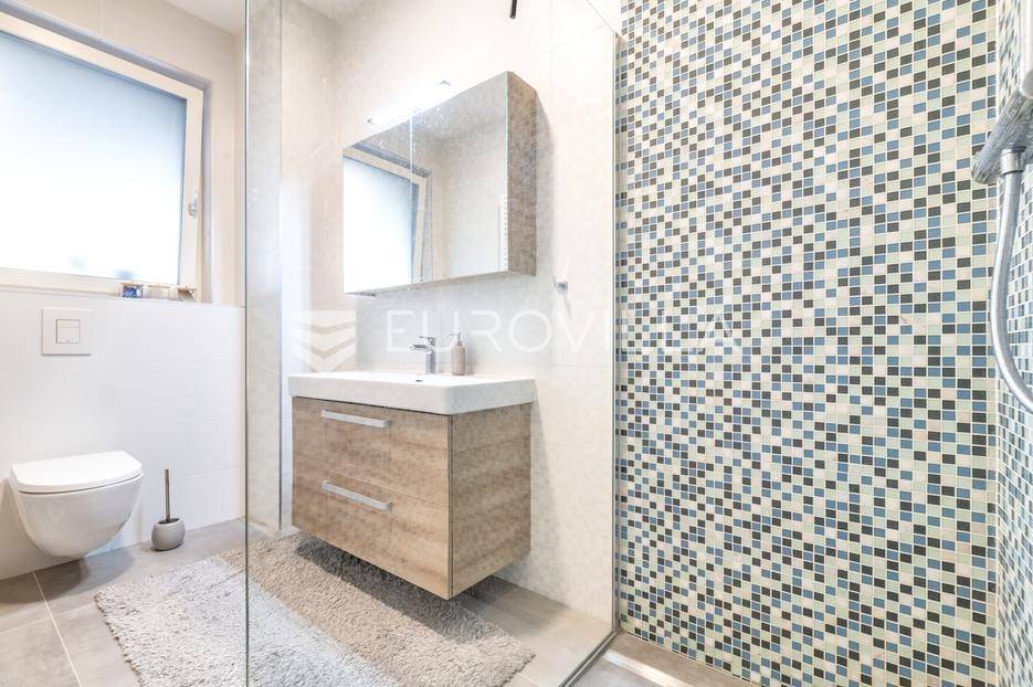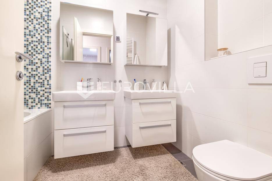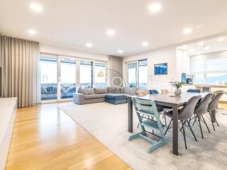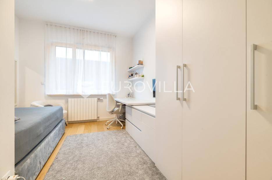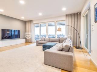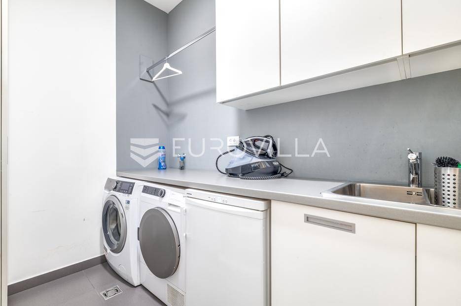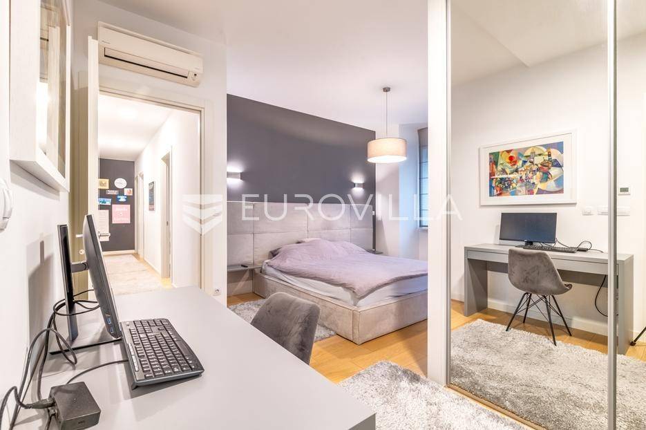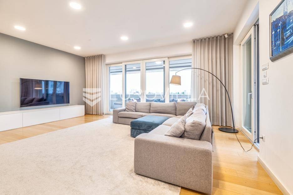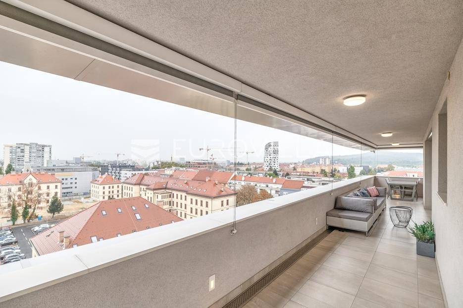 Zagreb, Črnomerec, VMD stambeno-poslovni kvart u ulici Kuniščak, luksuzan peterosoban stan u modernoj i kvalitetnoj novogradnji iz 2017. godine.Sastoji se od ulaznog hodnika, prostranog dnevnog boravka s kuhinjom i blagovaonicom površine 48 m2, koji izlazi na terasu, master spavaće sobe s walk in garderobom i kupaonicom s tušem, tri dječje sobe, druge kupaonice s kadom, vešeraja i gostinjskog toaleta.Dnevni boravak s kuhinjom i blagovaonicom je orijentiran na sunčanu južnu i zapadnu stranu, s otvorenim pogledom na grad, dok su spavaće sobe na istočnoj mirnoj strani odvojene od dnevnog dijela.Zatvorena površina stana iznosi 142,40 m2, natkrivena terasa 49,20 m2 (24,60 m2) te mu pripadaju dvije garaže površine 22,50 m2 (13,5 m2) i 22,40 m2 (13,44 m2). Ukupno obračunski NKP 194 m2.Kvalitetna oprema, podno grijanje u kupaonicama, hrastov parket, alu-drvo stolarija, komarnici, električni podizači roleta, dimni senzor, klimatizirane sve prostorije, centralni usisavač, centralni master prekidač, električne rolo tende preko cijele terase, izvrsna toplinska izolacija, alarm, video portafon. Stan je u potpunosti namješten i opremljen.Izvrsna lokacija, tramvaj zona, blizina centra, bolnica, dječji park ispred zgrade i odlična prometna povezanost s ostatkom grada.Za sve ostale informacije nas slobodno kontaktirajte.
