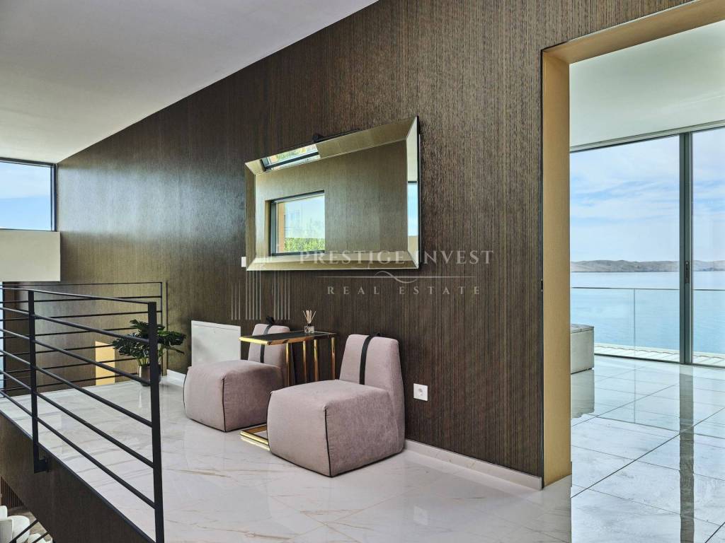Take a stroll through this villa and experience a sense of harmony with the surroundings and the Mediterranean nature, primarily due to its strategic location offering spacious, unobstructed views of the Zadar archipelago and islands. All rooms are fitted with high-quality triple-glazed aluminum windows, further highlighting the elegance of this impressive property. The outdoor space seamlessly integrates into the overall design, adorned with luxurious palm trees and garden plants.