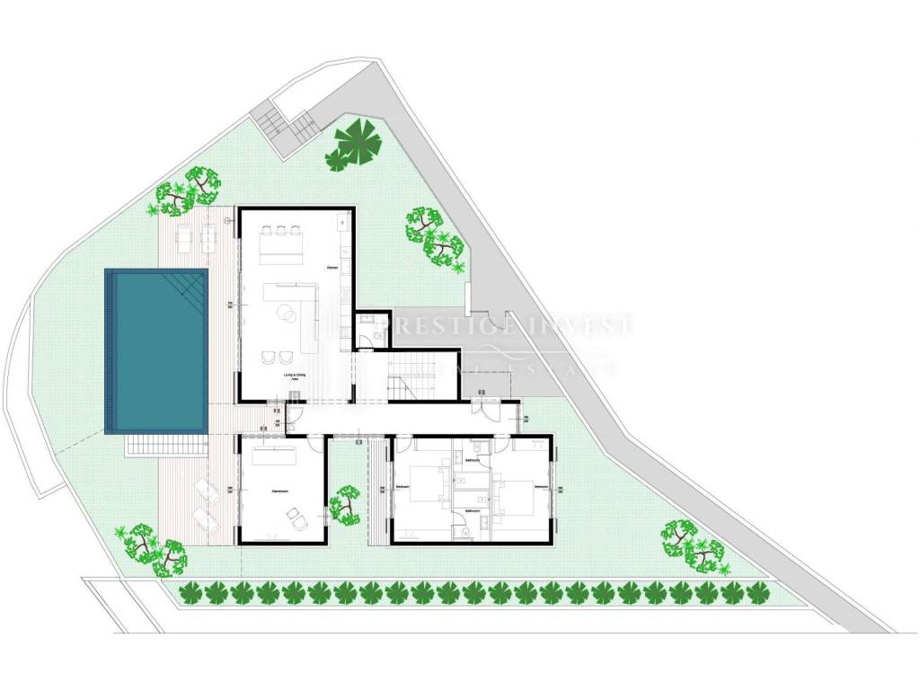 On the first floor there is a living room with a kitchen and a dining room in an open concept with access to an outdoor terrace with a garden and a swimming pool.
