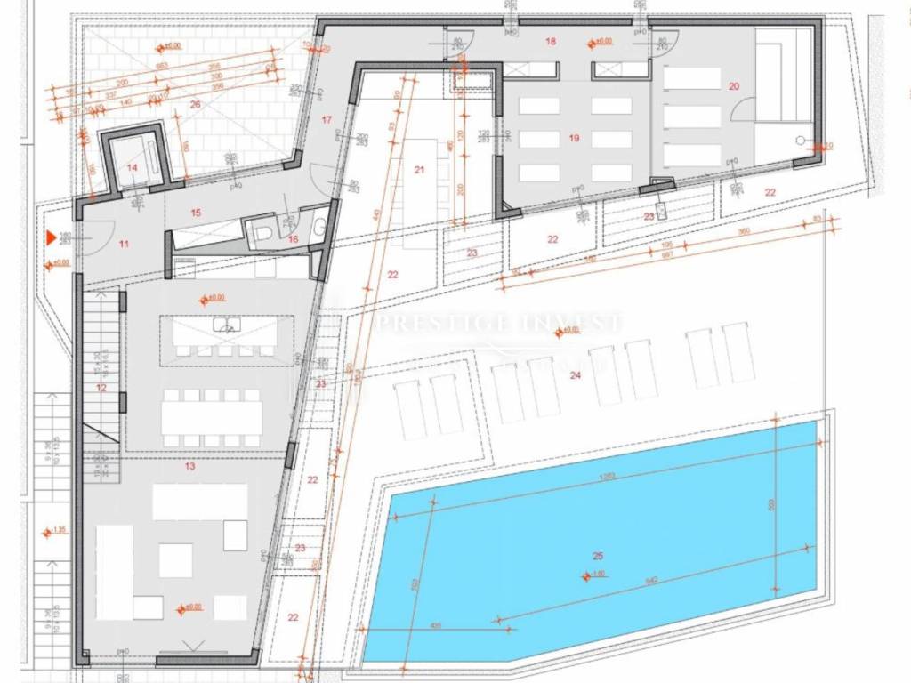 Ground floor: entrance area, toilet, kitchen with dining room, living room, gallery/hallway, staircase and ELEVATOR, private gym and sauna/relaxation area, covered and uncovered outdoor areas with swimming pool