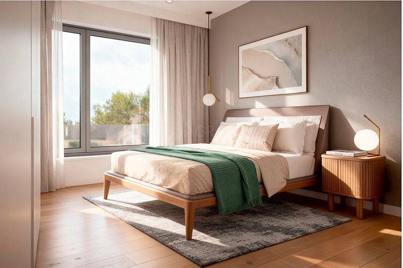 Upstairs, there are two elegant bedrooms. The master bedroom comes with a spacious walk-in wardrobe and access to a balcony, while the second bedroom offers equal comfort. A spacious bathroom is also located on this floor, and the balcony provides privacy and unforgettable summer evenings with sunset views.