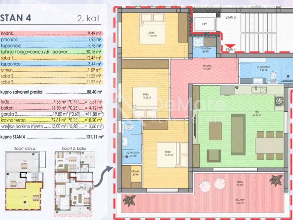 The total internal net area of the apartment is 88.40 m2, and the total calculated value of the area of the apartment with accessories is 131.11 m2.