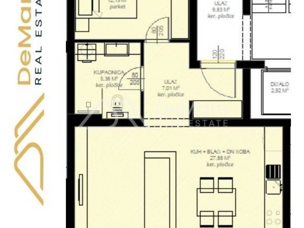 The building is built of high quality and will have an installed LIFT, the walls are built with brick blocks, and the thermal insulation will be 10 cm styrofoam. The floors will be covered with high-quality ceramic tiles and three-layer parquet, and carpentry made of three-layer PVC material will be installed with electric shutter lifters and built-in mosquito nets. Underfloor heating will be installed in the bathrooms, and air conditioning devices will be installed in the living room and bedrooms. The entrance door is fireproof and burglarproof, and an intercom will be installed at the entrance.