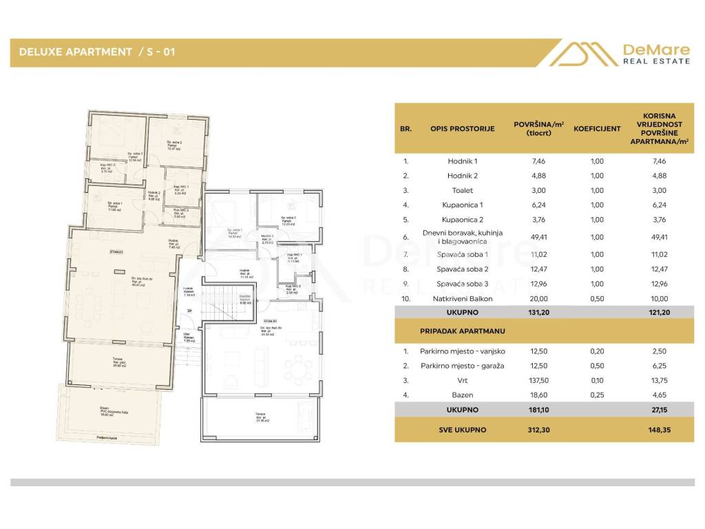 The apartment also includes two outdoor parking spaces (2 x 12.50 m2) and one garage parking space (12.50 m2) in the basement of the building.