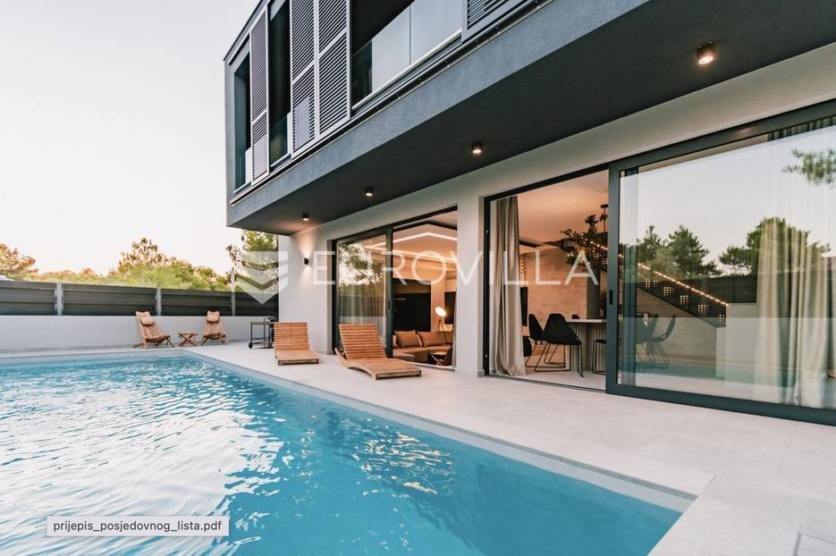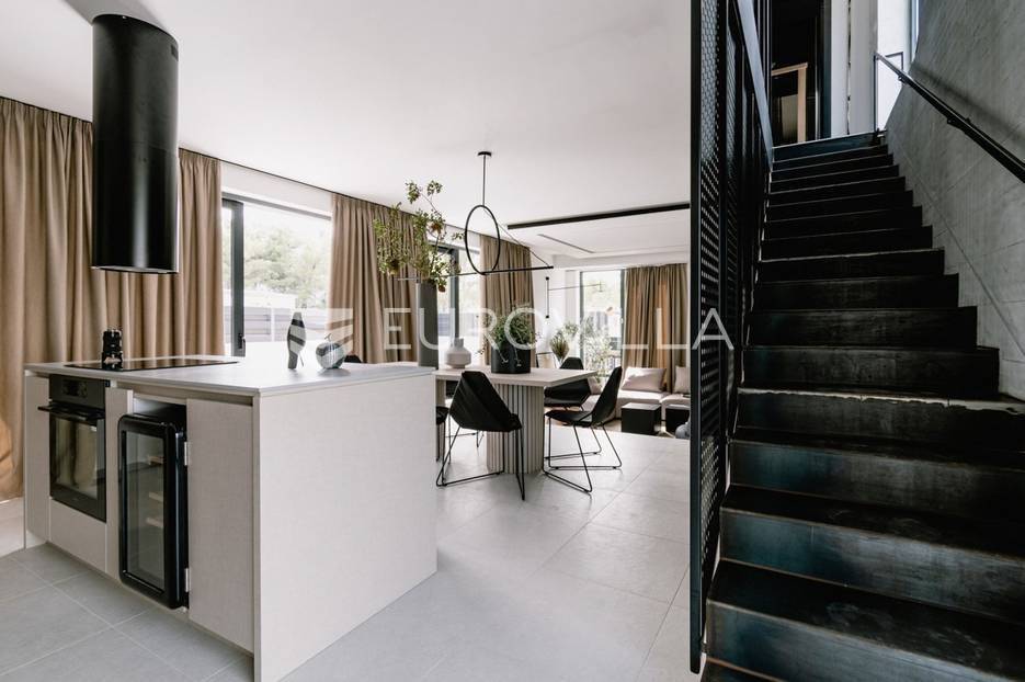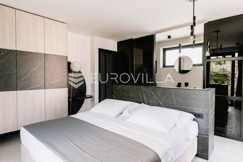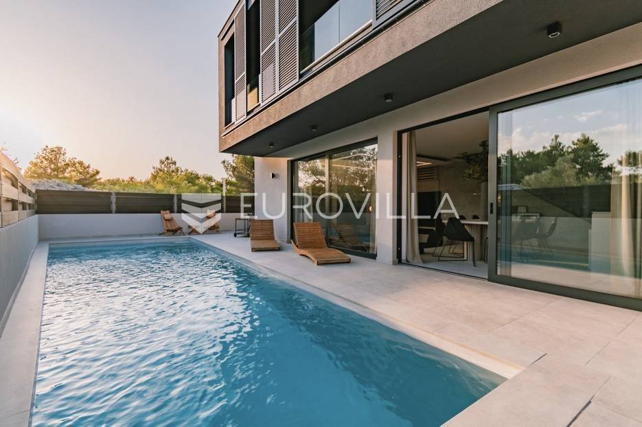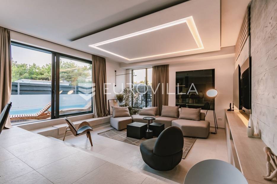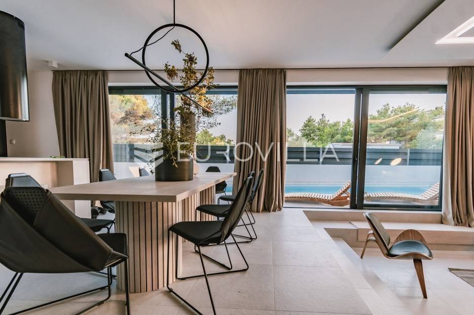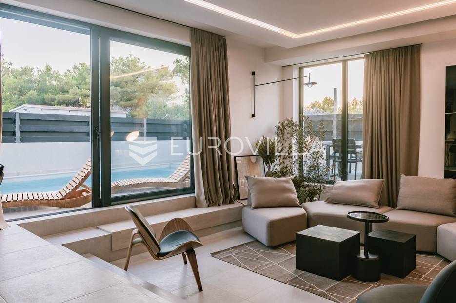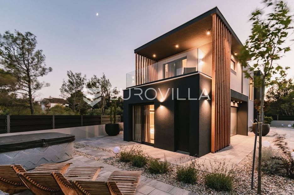 Novoizgrađena luksuzna vila smještena na mirnoj lokaciji u blizini Vodica, razvedena na dvije dizajnerski uređene etaže opremljene najkvalitetnijim materijalima i opremom.Na prizemnoj etaži smješteni su dnevni boravak, kuhinja i blagovaona s izlazom na terasu obogaćenu lounge zonom, jacuzzijem i bazenom od cca. 40m2 te sunčalištem, od jedne spavaće sobe s kupaonicom, gostinjskog toaleta i spremišta.Prva etaža je funkcionalno osmišljen spavaći prostor koji se sastoji od tri spavaće sobe od kojih dvije imaju vlastite kupaonice i izlaz na terasu/loggiu.Moderna arhitektura vile pruža maksimalnu udobnost i diskreciju, a obuhvaća atraktivni interijer i nadahnjujuće vanjske terase upotpunjene mediteranskim biljem i maslinama.Villa ima klimatizacijske jedinice u dnevnom dijelu, kao i u svim sobama te ugrađeno podno grijanje u kupaonicama tako da je idealna i za boravak tijekom cijele godine.Vanjski parking dostupan je ispred vile.Vila je potpuno namještena i spreman za useljenje.Dostupna je u periodu od 06.11.2025 do 01.04. 2026. godine. U cijenu najma nisu uključene režije.Za sve ostale informacije na upit.
