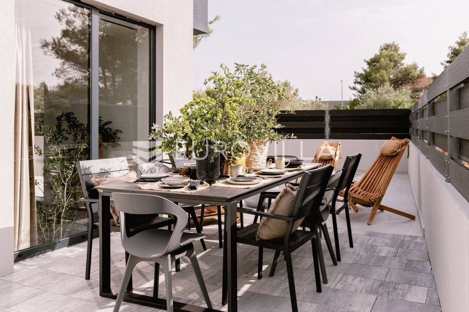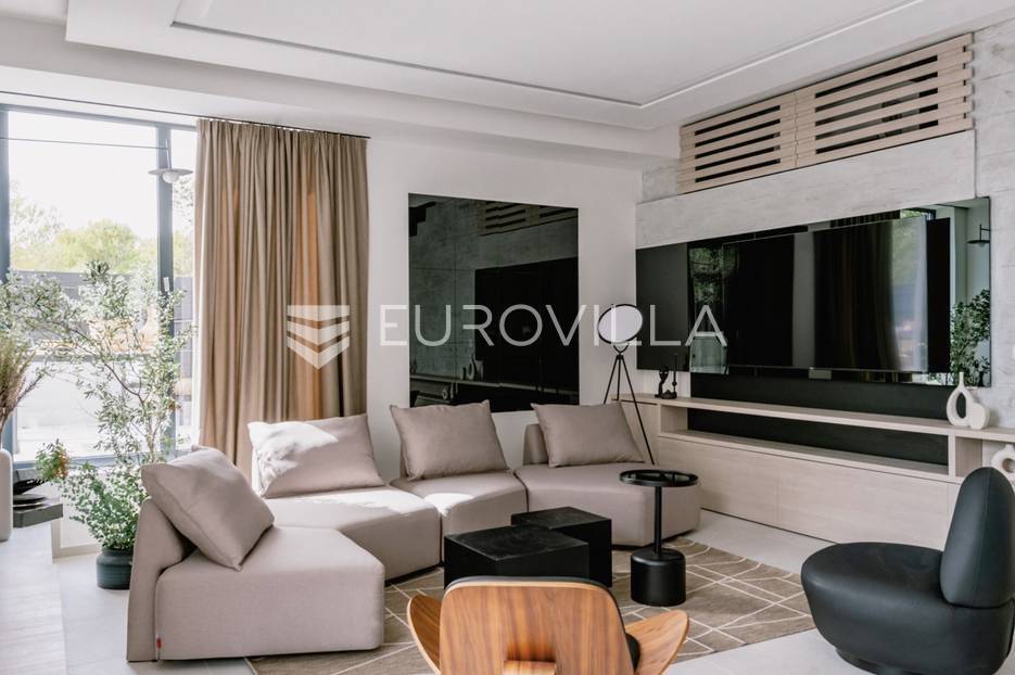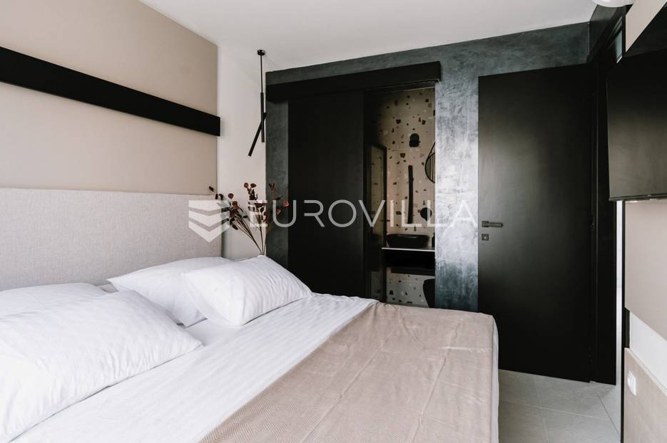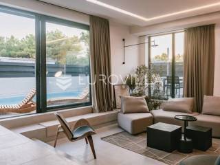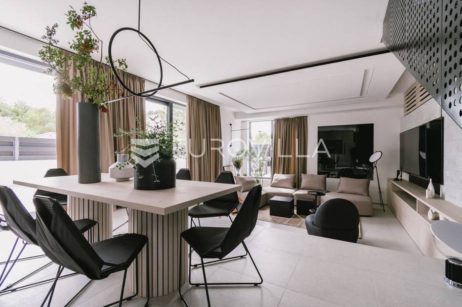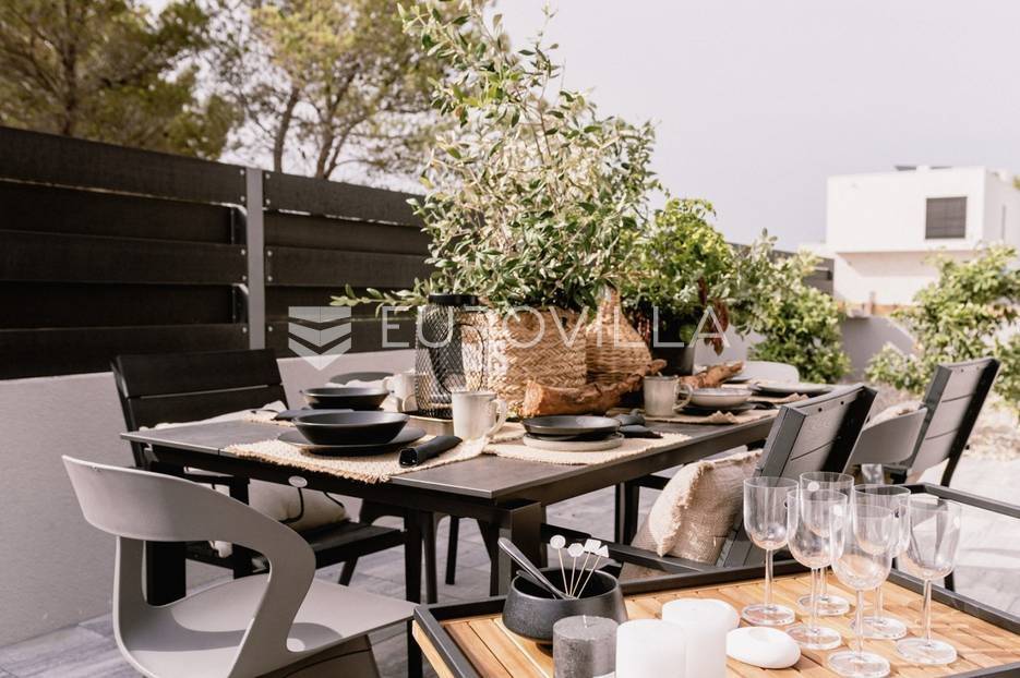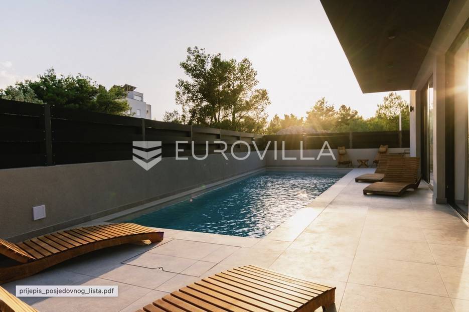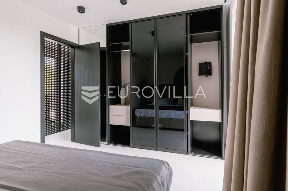 Novoizgrađena luksuzna vila smještena na mirnoj lokaciji u blizini Vodica, razvedena na dvije dizajnerski uređene etaže opremljene najkvalitetnijim materijalima i opremom.Na prizemnoj etaži smješteni su dnevni boravak, kuhinja i blagovaona s izlazom na terasu obogaćenu lounge zonom, jacuzzijem i bazenom od cca. 40m2 te sunčalištem, od jedne spavaće sobe s kupaonicom, gostinjskog toaleta i spremišta.Prva etaža je funkcionalno osmišljen spavaći prostor koji se sastoji od tri spavaće sobe od kojih dvije imaju vlastite kupaonice i izlaz na terasu/loggiu.Moderna arhitektura vile pruža maksimalnu udobnost i diskreciju, a obuhvaća atraktivni interijer i nadahnjujuće vanjske terase upotpunjene mediteranskim biljem i maslinama.Villa ima klimatizacijske jedinice u dnevnom dijelu, kao i u svim sobama te ugrađeno podno grijanje u kupaonicama tako da je idealna i za boravak tijekom cijele godine.Vanjski parking dostupan je ispred vile.Vila je potpuno namještena i spreman za useljenje.Dostupna je u periodu od 06.11.2025 do 01.04. 2026. godine. U cijenu najma nisu uključene režije.Za sve ostale informacije na upit.
