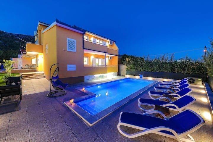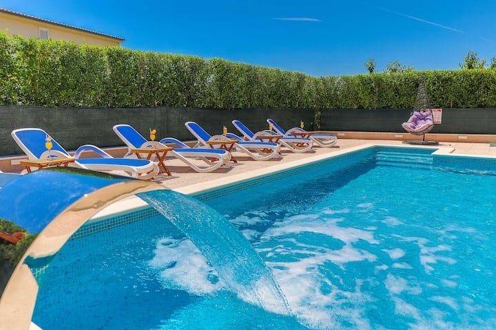 Posredujemo u prodaji lijepe kućes bazenom . Ista je raspoređena na podrum i dvije stambene etaže ( prizemlje i kat ). U prizemlju se nalaze 2 sobe, kuhinja s blagovaonicom i dnevnim boravkom, 2 kupatila , jedna sprema , balkon s južne strane i garaža.