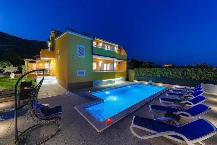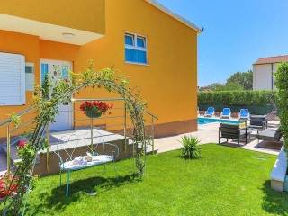 Iz prizemlja se ide u dvorište vile na kojem je smješten bazen, jedno manje dječje igralište i jedna ljetna kuhinja s prostom za druženja, sve skupa okruženo kultiviranom okućnicom.