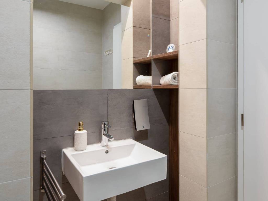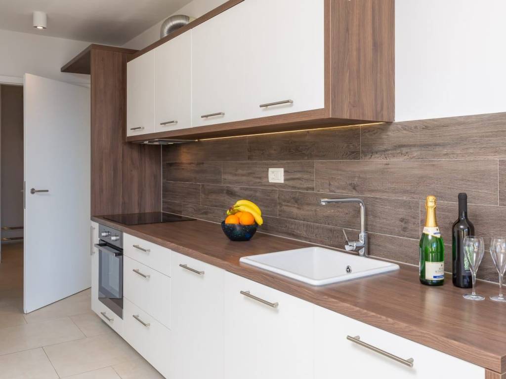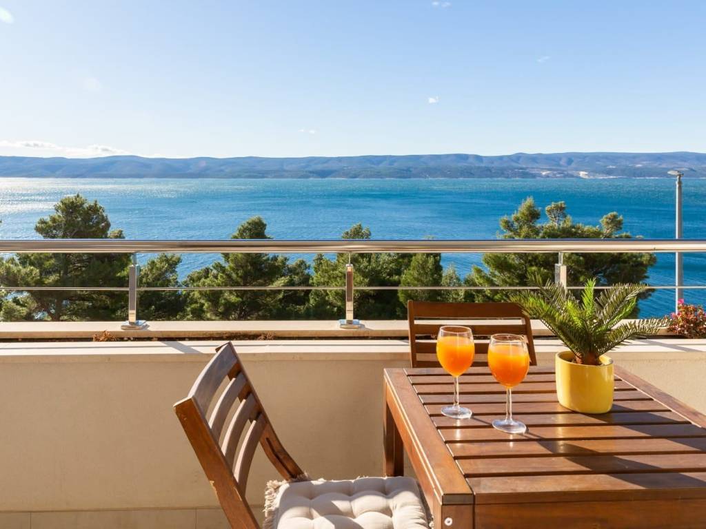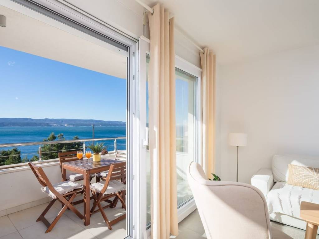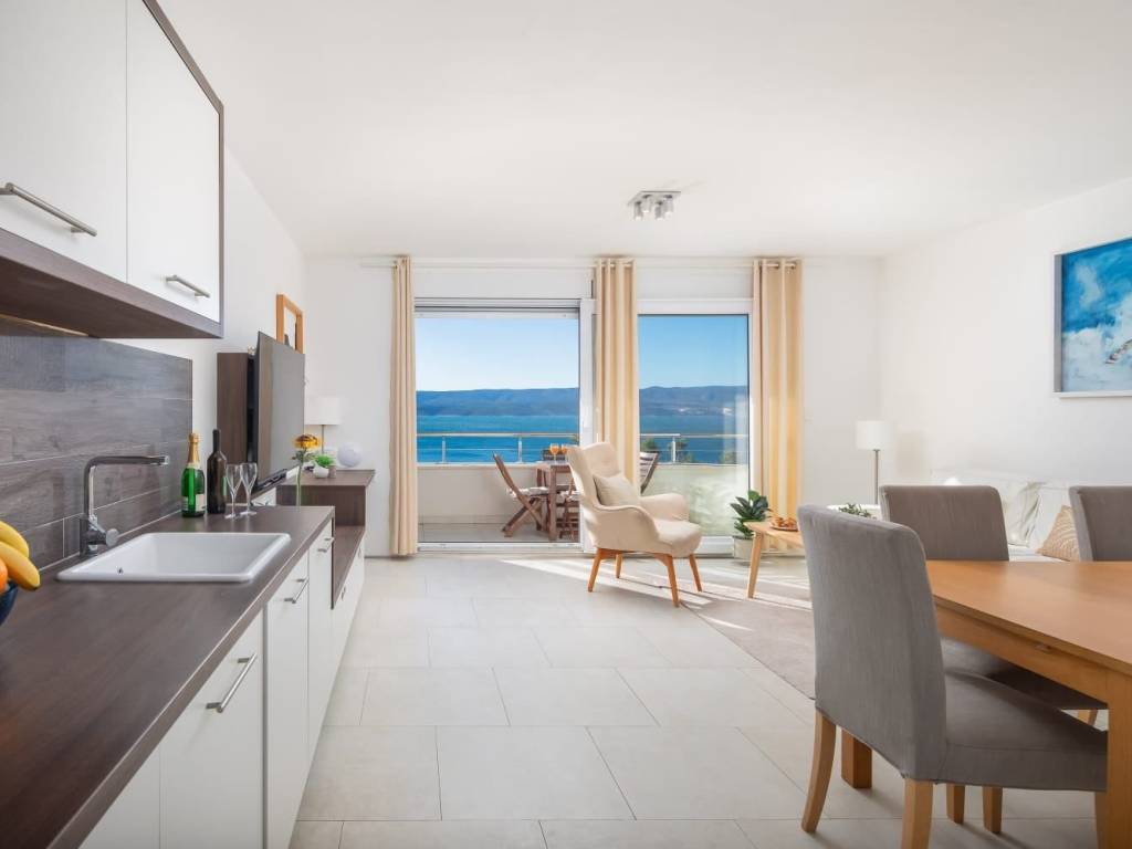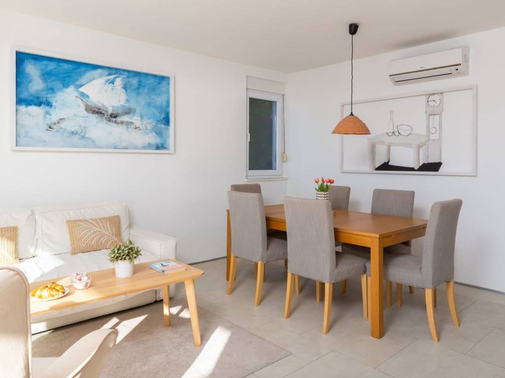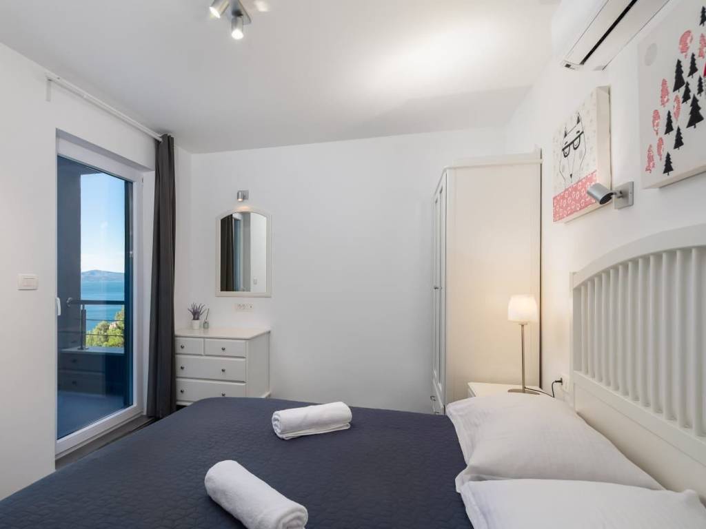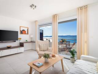 Prodajemo lijep i moderan stan u novijoj zgradi s liftom. Stan je položen na 2. katu , asastoji seod ulaza, jedne zasebne kupaonice, 2 spavaće sobe (od kojih je jedna manja s 2 odvojena kreveta, a druga je bračna soba s balkonom i vlastitom kupaonicom), kuhinje s blagovaonicom i dnevnim boravkom s izlazom na terasu sa predivnim i otvorenim pogledom na more. Stan je potpuno opremljen modernim i kvalitetnim namještajem ( sve prostorije su klimatizirane ) , te se kao takav i prodaje. Pored navedenog stan ima u prizemlju ostavu i na korištenje zajedničku prostoriju u kojoj su smještene perilica i sušilica. Ujedno vlasnici stana mogu koristiti i bazne i jacuzzi koji se nalaze u prizemlju zgrade.
