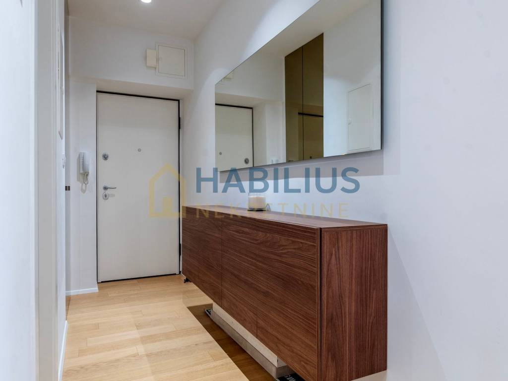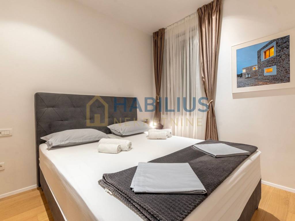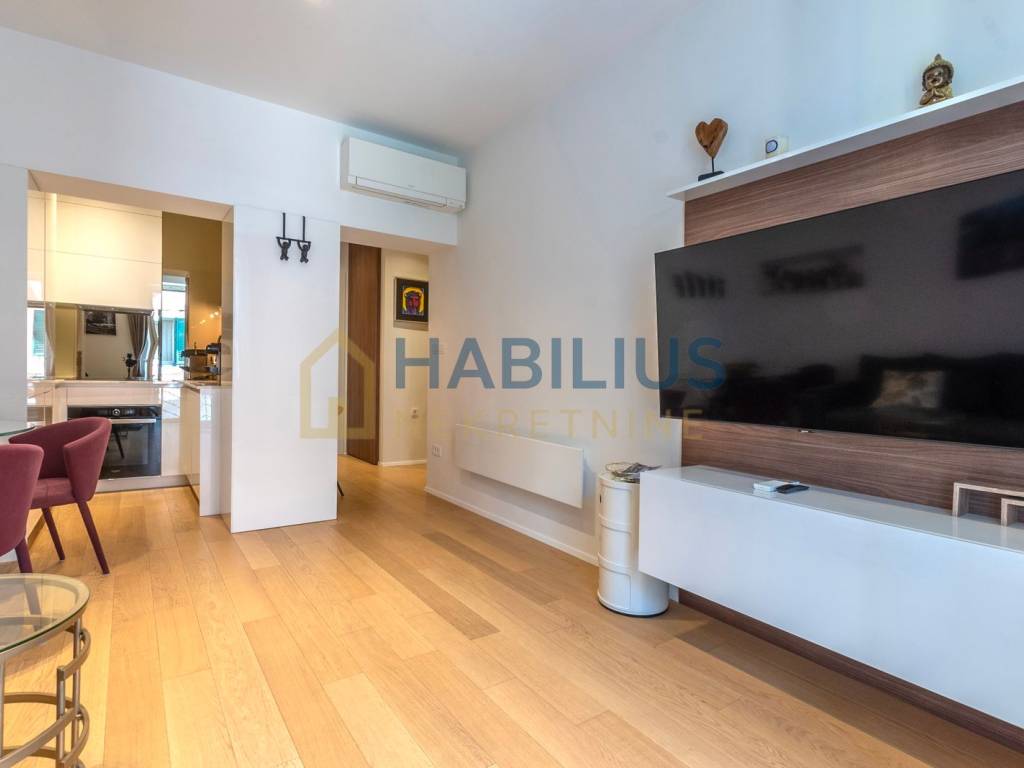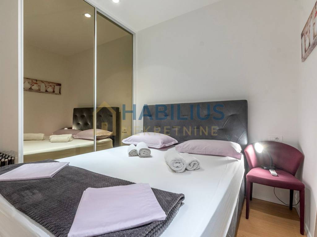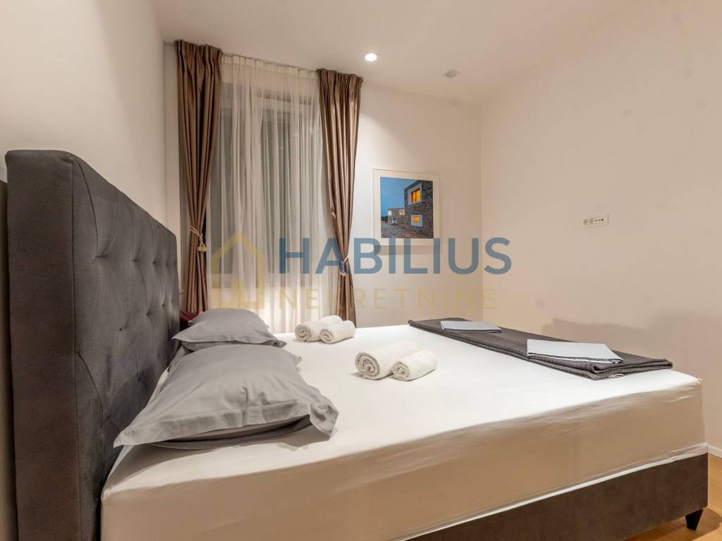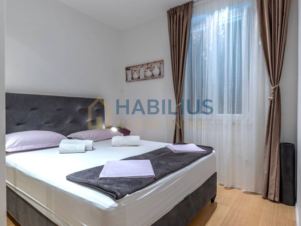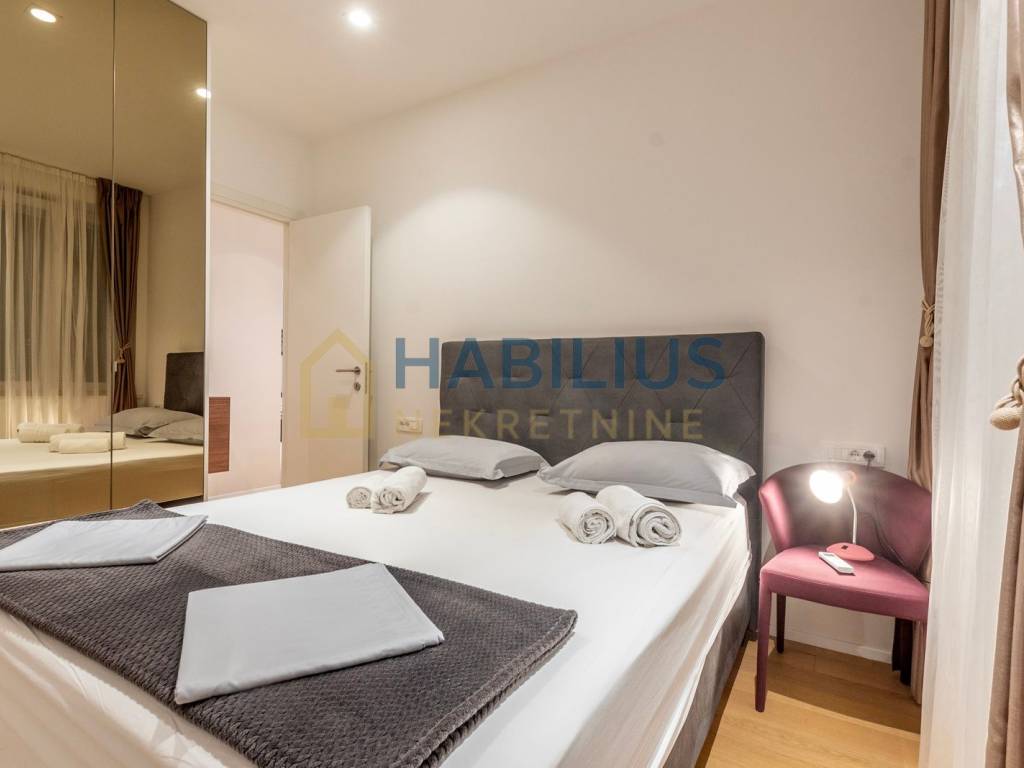 Sastoji se o velikog dnevnog boravka sa velikom smart Tv sa kabelskim programima, šarmantnim balkonom, blagavaonicom, kuhinjom, dvije spavaće sobe sa king size krevetima, velikom kupaonicom sa WCom, hodnikom sa upotrebljivim ormarima. Svaka soba i dnevni botravak imaju vlastiti AC - 3 kom. Svi aparati u stanu su kvalitetni, perilica i sušilica za rublje, perilica za suđe full opremljena kuhinja i sve ostalo šta je potrebno za život.