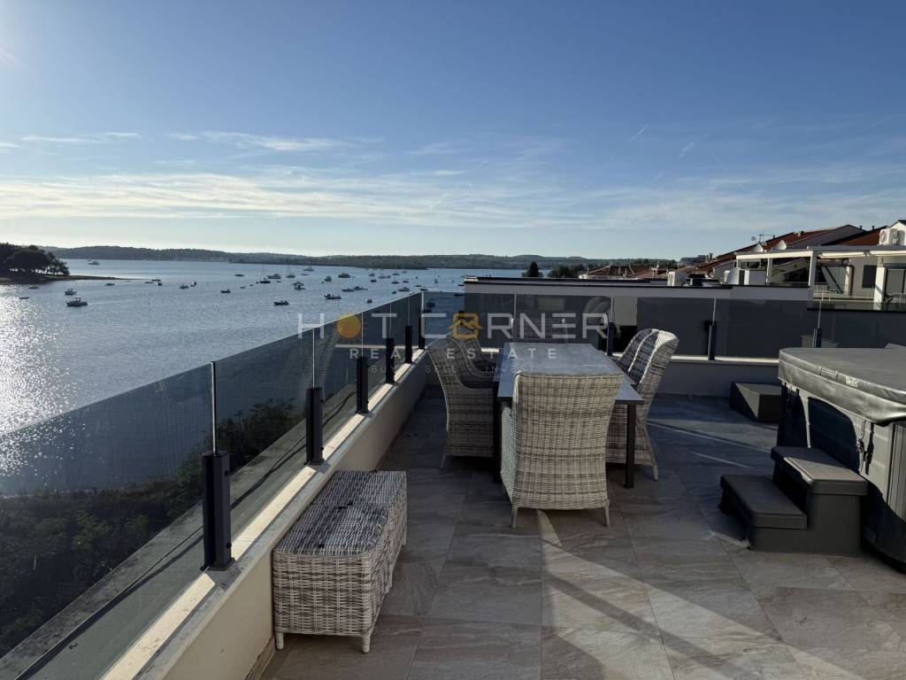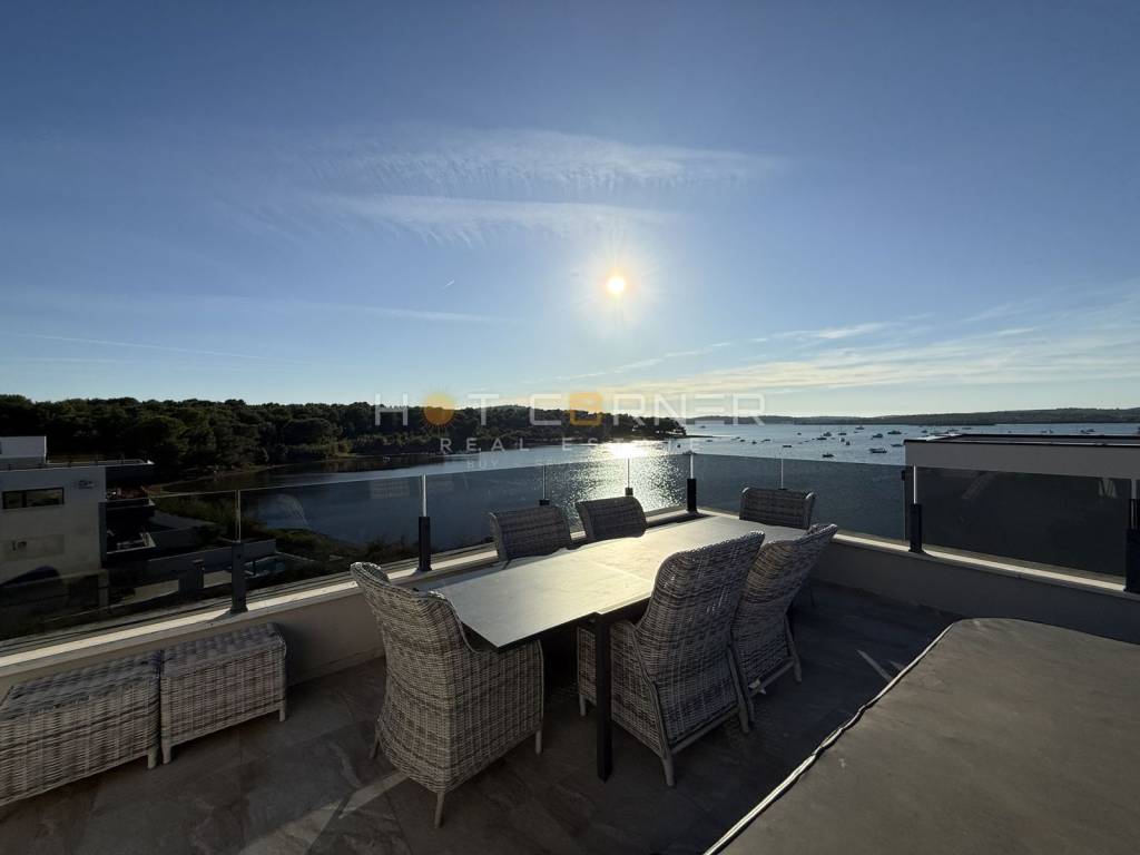 In una posizione fantastica, in prima fila sul mare, con vista aperta sul mare e sulla baia di Medulin fino a Pomer e Premantura, è in vendita un lussuoso attico con terrazza sul tetto e una vista mozzafiato.