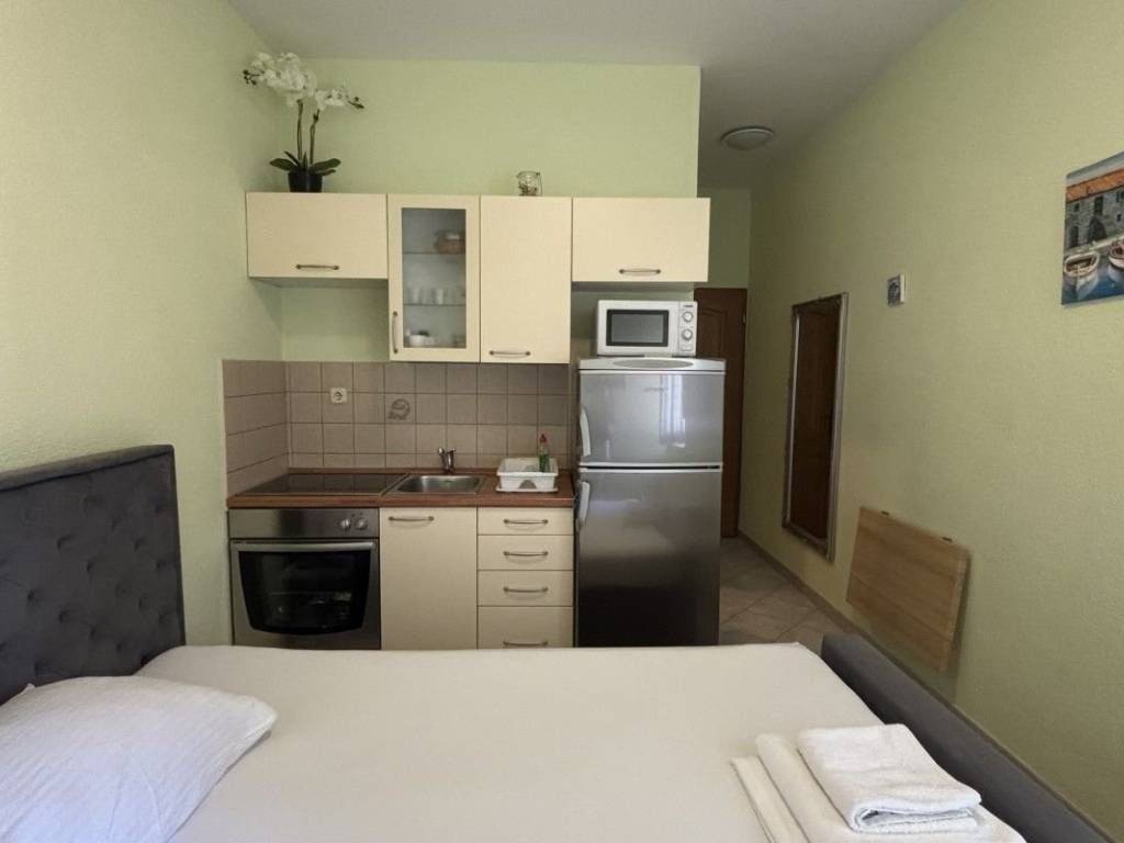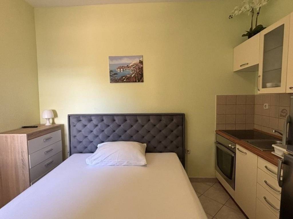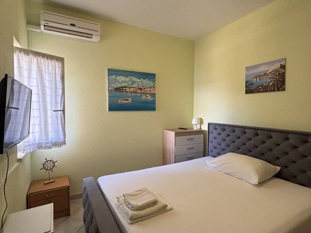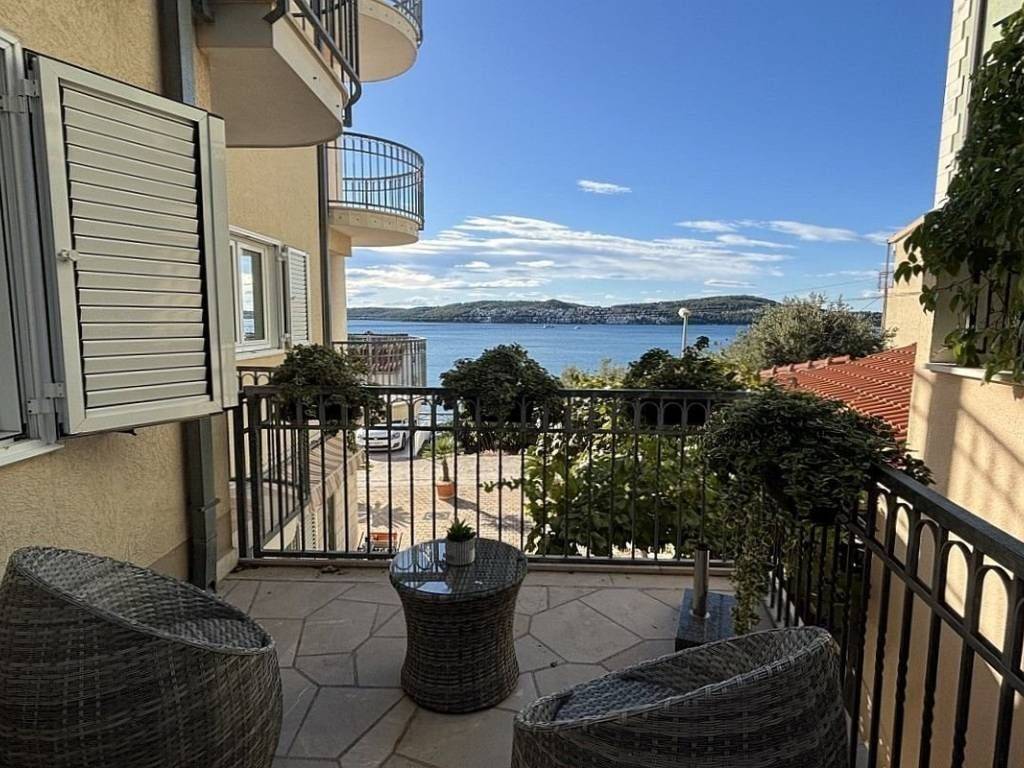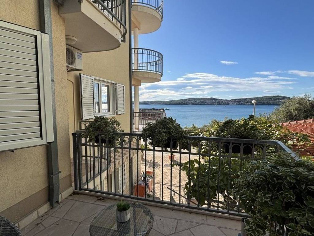 Studio apartment with a terrace overlooking the sea near Trogir, available for long term rent. The apartment is located on the first floor of an apartment building in a quiet location. The orientation of the apartment is southwest, which ensures enough natural light throughout the day and a pleasant airiness of the space. The apartment covers some 25 m² of living space, and it also has an exit to a terrace of some 10 m² with a sea view. The apartment is fully furnished and equipped and is rented as such. Heating and cooling are regulated by air conditioner, and the apartment also has an outdoor parking space, which is a great convenience. It is equipped with a kitchen, refrigerator, TV and table, and there is a laundry room on the ground floor. In the immediate vicinity of the building there are all the necessary facilities for a pleasant and quality everyday life – shops, bakery, cafes, restaurants and other services. The location of the facility ensures excellent connections to the center of Trogir and the surrounding area, while the position itself in a quiet neighborhood provides the ideal balance between urban life and privacy.