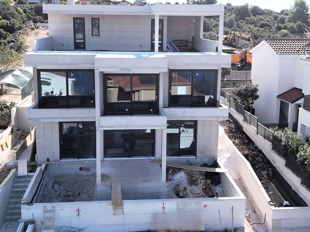 For sale is a modern villa under construction, located in the small yet increasingly popular tourist destination of Ražanj, near Rogoznica.   The villa occupies an attractive position, just 50 meters from the sea in the second row, offering stunning sea views and magnificent sunsets. Spread over three floors and a total of 220 m², the villa sits on a 562 m² plot. A 32 m² swimming pool adds exceptional value to the property, whether purchased as an investment or for personal enjoyment. The listed price refers to the current (shell) stage of construction. There is also an option to purchase the villa fully completed, by arrangement with the investor. The villa is currently under construction, the concrete structure is finished and windows has been installed.   The buyer has the opportunity to participate in the finishing phase together with the investor and customize the interior according to personal preferences.   The ground floor (100 m²) includes an entrance hall, guest WC, storage room, and a spacious open-plan kitchen, dining, and living area with access to the terrace. The outdoor area features a pool, sun deck, garden, and barbecue area. The first floor offers three large bedrooms, each with its own bathroom and covered terrace. The top floor (attic level) includes a sauna, jacuzzi, sun deck, and a covered summer kitchen with dining area and pergola. Heating and cooling are provided via an air conditioning system, and underfloor heating is installed in the bathrooms.   An ideal location, high-quality construction, unobstructed sea view, and crystal-clear water are just some of the many advantages this exceptional property offers.   All amenities – fine restaurants, cafés, shops, and even a taxi boat to Rogoznica – are within a 15-minute walk.