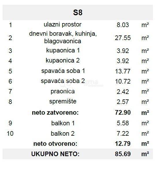 NEW BUILD – MODERN APARTMENT WITH BALCONIES AND SEA VIEW, LESS THAN 150 m FROM THE BEACH – OKRUG GORNJI For sale: a modern apartment in a high-quality new development in Okrug Gornji, located less than 150 meters from the sea and the beach. The building is in the final phase of construction, and some residents have already moved in, confirming high craftsmanship, quality, and a pleasant community atmosphere. The apartment consists of: entrance area – 8,03 m² living room with kitchen and dining area – 27,55 m² bathroom 1 – 3,92 m² bathroom 2 – 3,92 m² bedroom 1 – 13,77 m² bedroom 2 – 10,72 m² laundry – 2,42 m² storage – 2,57 m² Net closed area: 72,90 m² Balconies: 12,79 m² Total net area: 85,69 m² The apartment is oriented north–south, ensuring plenty of natural light and excellent ventilation throughout the day. Balconies with a beautiful sea view are perfect for enjoying warm Mediterranean evenings. The building is constructed to the highest standards: garage with parking spaces and private storage rooms (each with electricity from the apartment) two staircases, each with an elevator (eastern section with 2, western with 3 apartments per floor) security, fireproof, and smoke-resistant doors video intercom with key card and remote unlocking underfloor heating in living rooms and bathrooms triple-glazed windows, electric shutters, insect screens air-conditioned rooms and living areas optical cable for high-speed internet excellent thermal and sound insulation Location benefits: less than 150 m from the sea and beach peaceful and prestigious neighborhood with greenery uninterrupted sea and island view close to restaurants, cafés, shops, sports facilities, and marina excellent transport connections: Trogir 4 km, Split Airport 5 km, Split 28 km Ideal for permanent living, vacation, or smart investment with high return potential. ID CODE: ST4289 Nino Matas Asistent u posredovanju Mob: 097/681-3903 Tel: +385 21 293 201 E-mail: nino.matas@dogma-nekretnine.com www.dogma-dalmacija.com