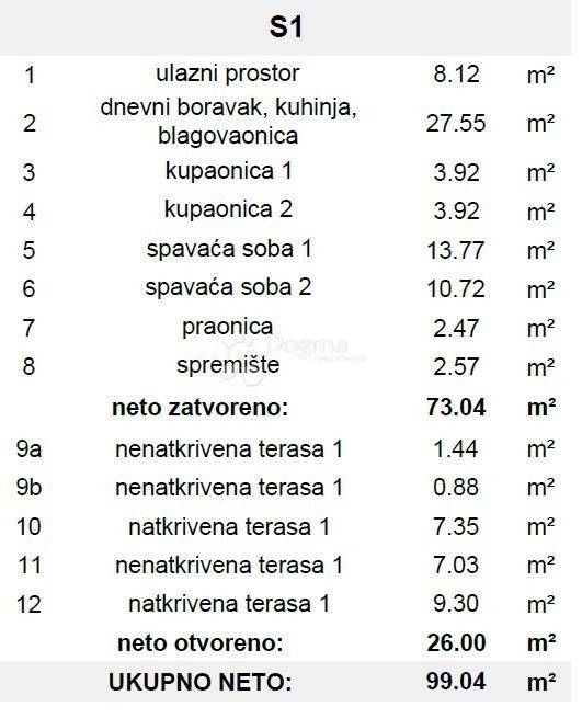 OKRUG GORNJI – NEW BUILDING – SPACIOUS MODERN APARTMENT WITH TERRACES, 150 m FROM THE BEACH Property Description: Spacious and fully equipped apartment with a total net area of 99.04 m² in a new building nearing completion, already partially occupied, ensuring quality and reliability. The apartment is north–south oriented, featuring beautiful covered and uncovered terraces with a permanent view of the clear Adriatic Sea, abundant natural light, and a serene Mediterranean atmosphere. Layout: Entrance hall: 8.12 m² Living room, kitchen & dining area: 27.55 m² Bathroom 1: 3.92 m² Bathroom 2: 3.92 m² Bedroom 1: 13.77 m² Bedroom 2: 10.72 m² Laundry: 2.47 m² Storage: 2.57 m² Terraces: Uncovered: 11.44 m² + 0.88 m² + 7.03 m² Covered: 7.35 m² + 9.30 m² Total open area: 26.00 m² Apartment Features: Underfloor heating in living rooms and bathrooms Air-conditioned rooms and living areas Triple-glazed windows and electric shutters Mosquito screens Fiber optic cable for ultra-fast internet Video intercom with key, card, or remote access Floors with 4–5 cm thermal and sound insulation Walls between apartments: 20 cm reinforced concrete with 5 cm mineral wool and diamond gypsum boards Security, fireproof, and smokeproof entrance doors Building Advantages: New construction, nearing completion, already partially occupied Underground garage with parking spaces and storage units Two staircases with lifts Unobstructed sea view Asphalted access road 8–9 m wide Location Benefits: Only 150 m from the sea and beach – perfect for swimming, sunbathing, and water activities Quiet and prestigious area of Okrug Gornji Uninterrupted sea view and surrounding Mediterranean landscape Close to restaurants, cafés, shops, sports facilities, and marina Quick access to town center and main roads Distances: Split Airport approx. 5 km, Trogir approx. 4 km, Split approx. 28 km Ideal for permanent residence, vacation, or investment ID CODE: ST4285 Nino Matas Asistent u posredovanju Mob: 097/681-3903 Tel: +385 21 293 201 E-mail: nino.matas@dogma-nekretnine.com www.dogma-dalmacija.com