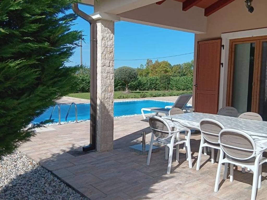 Di fronte alla casa si trova una piscina esterna, accanto alla piscina si trovano un parco giochi per bambini e una terrazza con cucina estiva, dove si trovano un camino per barbecue e un tavolo per godersi il sole all'aperto.