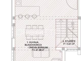 Prizemlje nudi elegantan dnevni prostor otvorenog koncepta – moderno opremljenu kuhinju, blagovaonicu i raskošno uređeni dnevni boravak. Tu su i gostinjski toalet te diskretno smješteno spremište.