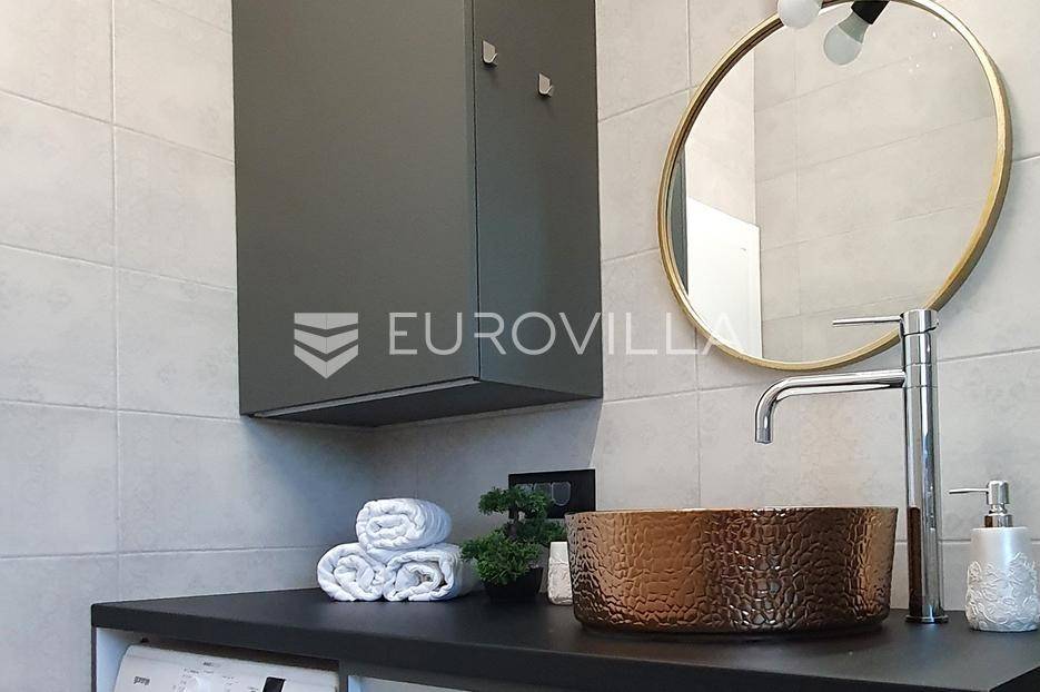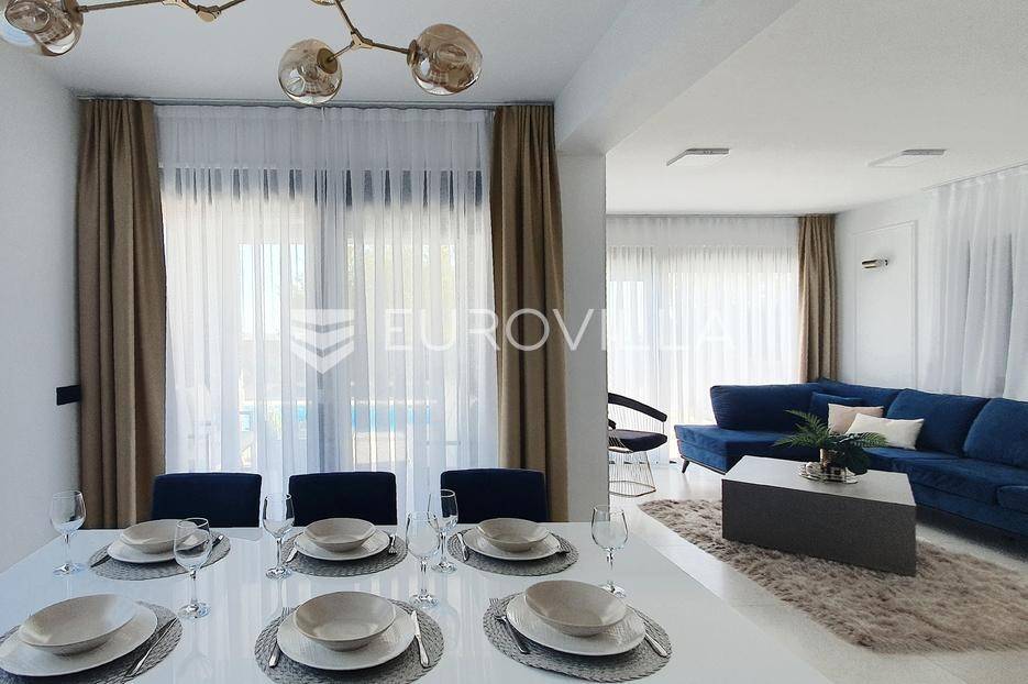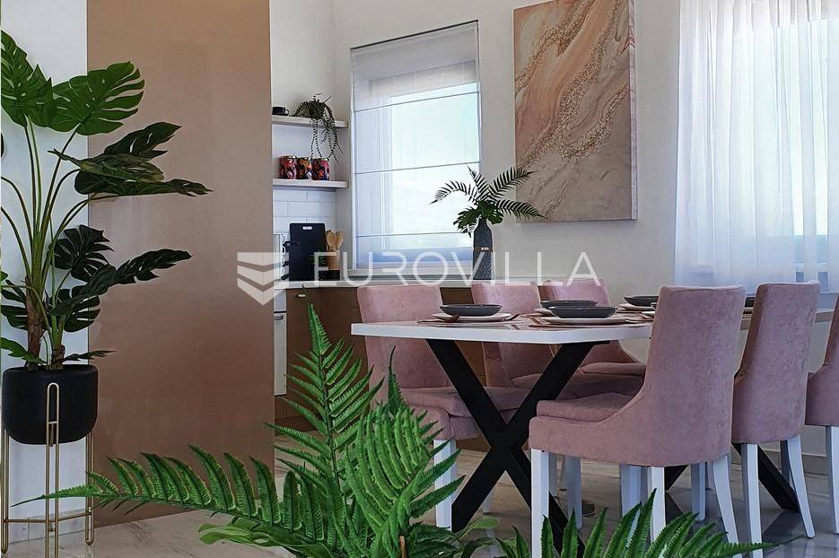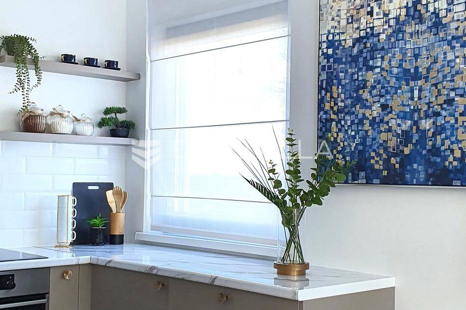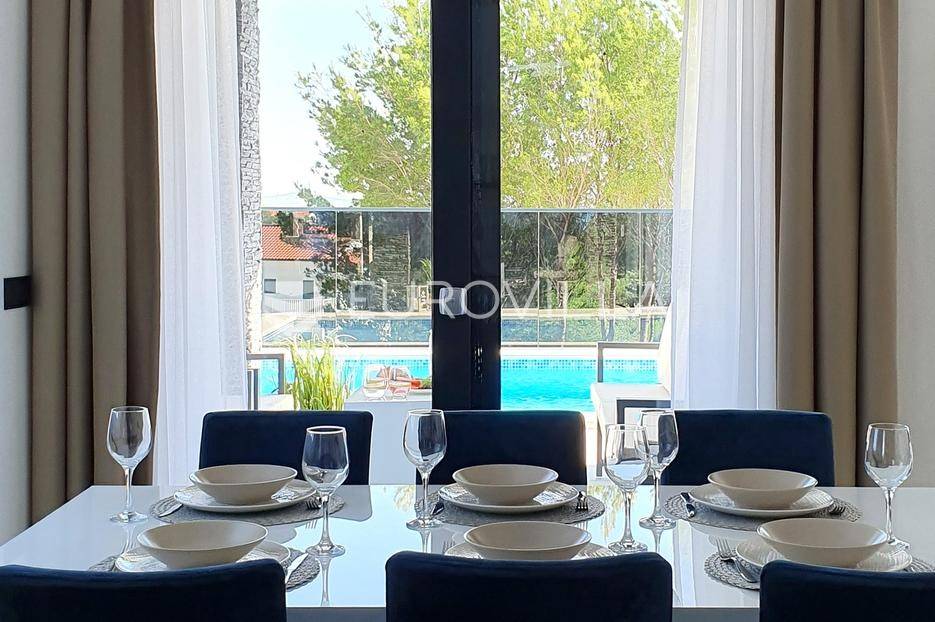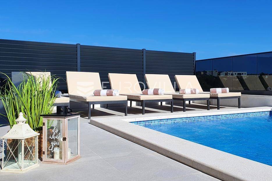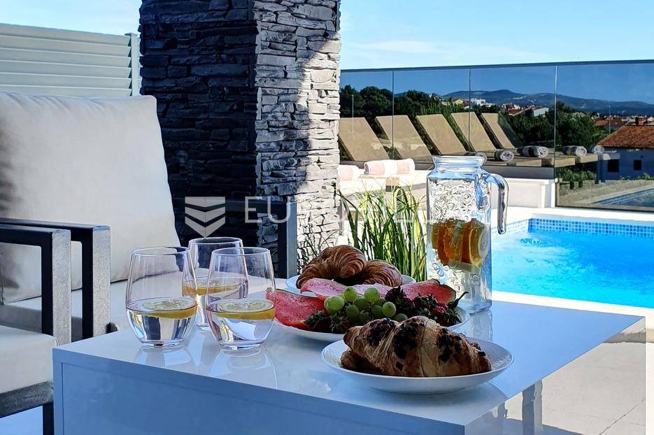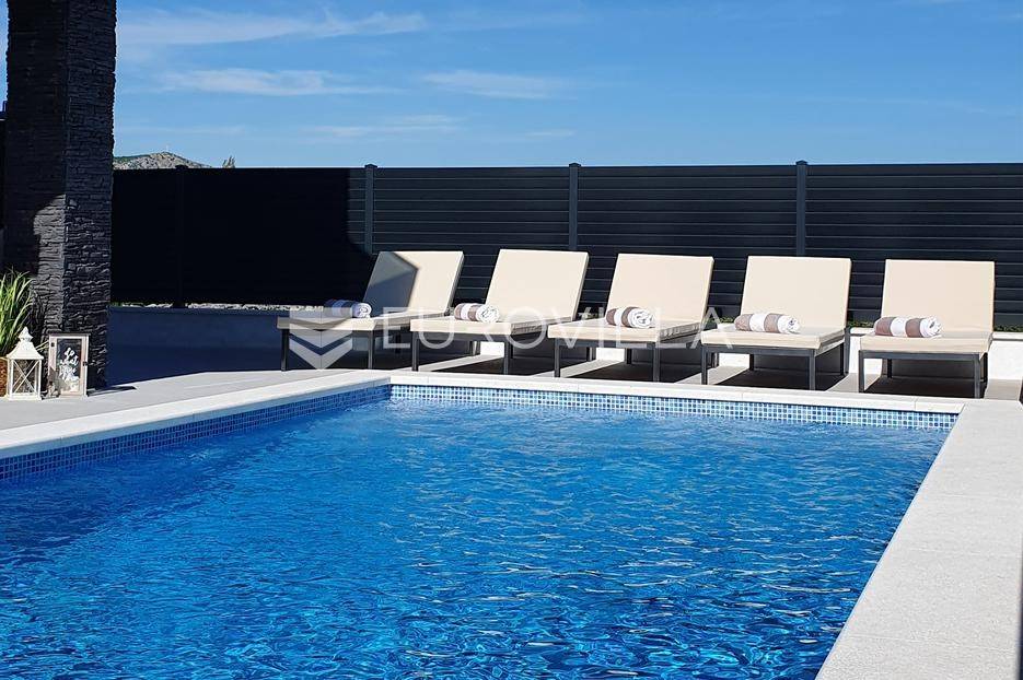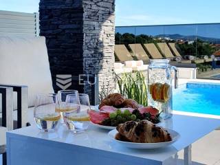 Šibenik, Podsolarsko, prekrasna kuća s bazenom i pogledom na more površine 178,96 m². Iznajmljuje se na duži period, uključujući i ljeto.Izgrađena na 2 etaže na parceli od 347 m². Sastoji se od dva stana od kojih svaki ima prostrani dnevni boravak s kuhinjom i blagovaonicom, dvije spavaće sobe, kupaonicu te lijepu natkrivenu terasu s pogledom na more. Do stana na katu dolazi se vanjskim stepenicama. U prizemlju se iz dnevnog boravka izlazi u dvorište gdje je smješten grijani bazen i sunčalište.Oko kuće se prostire lijep vrt, te prostor za sunčanje. Kuća ima parking za 2 automobila, te je pored kuće moguće parkirati još automobila na javnoj površini. Mikrolokacija kuće je odlična, nalazi se blizu plaže, te samo nekoliko kilometara od Šibenika.Sve ostale informacije na upit.