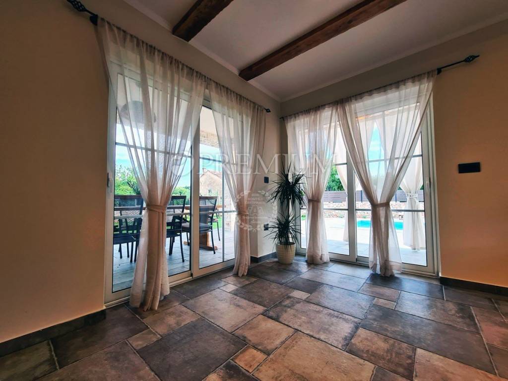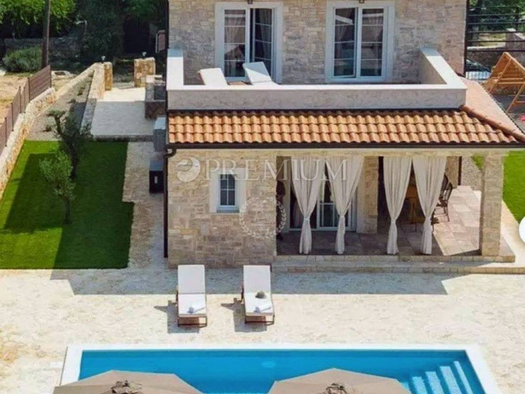 Isola di Krk, dintorni di Dobrinj, vendita di una casa indipendente con piscina ai margini della zona di costruzione, posizione tranquilla! La casa, con una superficie di 167 mq, è composta da un piano terra e un primo piano. Al piano terra si trova un ingresso, 2 WC, un ripostiglio, una camera per gli ospiti con il proprio bagno, una cucina con zona pranzo e un soggiorno con accesso ad una terrazza coperta (20 mq). Dalla terrazza si accede al giardino, dove si trova una piscina riscaldata (dimensioni 8m x 3,5m) con zona solarium. Il giardino è ben curato e curato, è installata l'irrigazione e dispone anche di un camino, un parco giochi per bambini e 5 posti auto. Al primo piano della casa ci sono 3 camere da letto, ciascuna con il proprio bagno. Due camere condividono una terrazza di 22 m2 con vista sul verde. La casa ha un'ottima disposizione ed è ideale per uso personale o investimento. È dotato di una combinazione di infissi in alluminio e PVC, pavimenti in ceramica, riscaldamento a pavimento, aria condizionata aggiuntiva in tutte le stanze e dispone anche di videosorveglianza. Posizione estremamente tranquilla, immersa nel verde, ai margini della zona di costruzione!