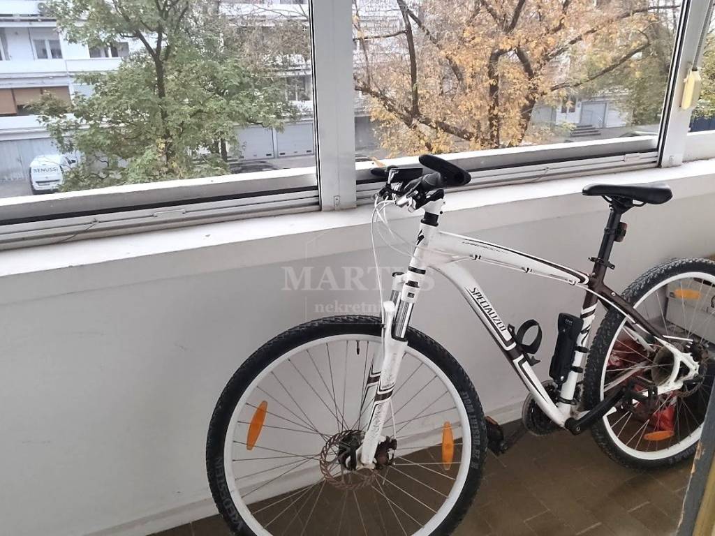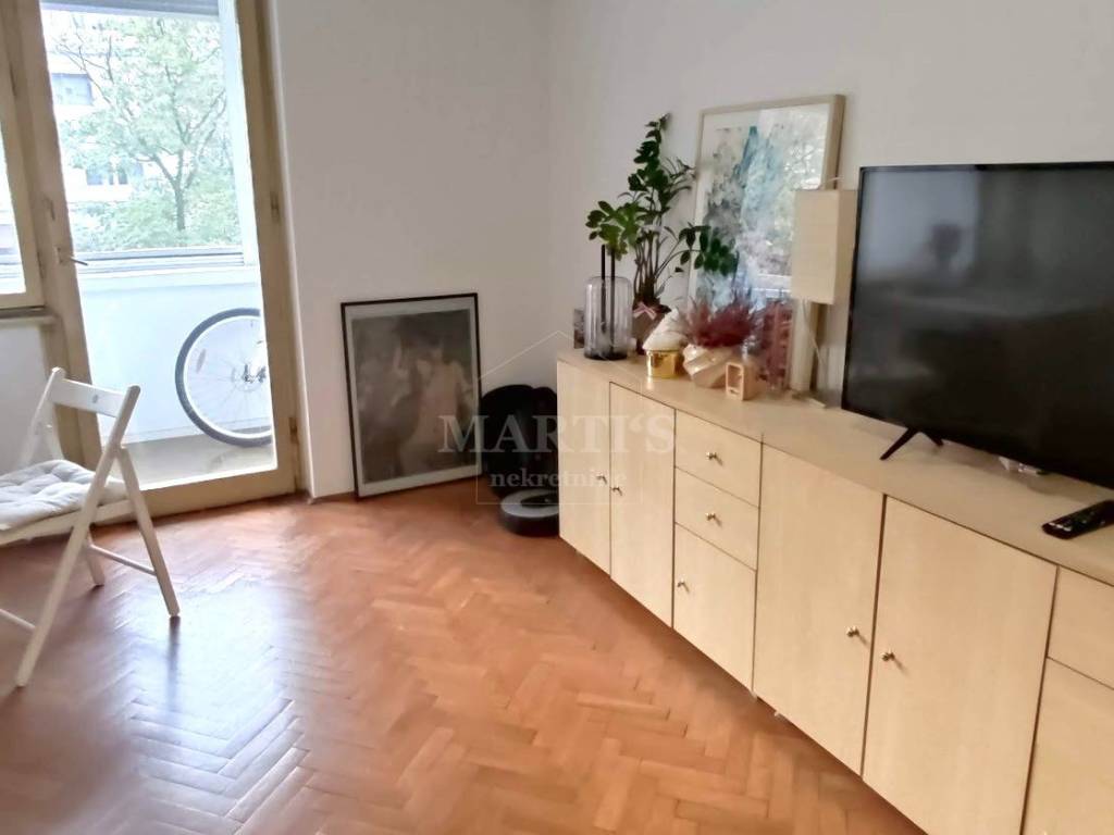 STAN: ulazni garderobni hodnik, velika dnevna soba s blagovaonicom i izlazom na zatvorenu, zapadnu lođu, pregrađena ormarom i policama, iza kojih je krevet i spavaonica, kuhinja, kupaonica, ostava i zatvorena lođa. Lođa se, prema mogućnostima i uz adaptaciju, može prenamijeniti i uključiti u stambeni prostor – što su već učinili brojni stanari u zgradi. Stanu pripada i podrumsko spremište od 1.90 m2.