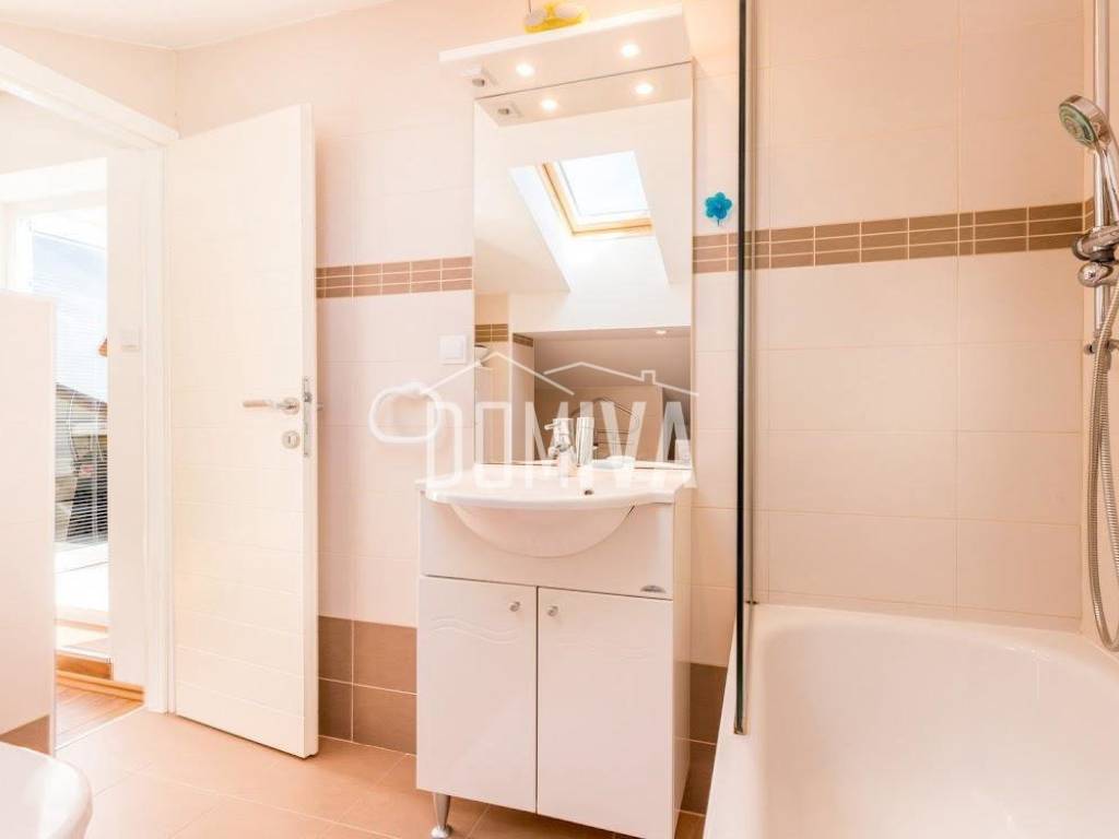 Prodaje se dvoetažni stan na drugom katu. Prvi dio stana sastoji od: hodnika, degažmana, dvije sobe, dvije kupaone, kuhinje, blagovaone, dnevnog boravka, balkona i lođe ukupne površine 92,29m2. U drugi dio stana (cca50m2), dolazi se unutarnjim stepenicama, u potkrovlju je kupaonica,  prostorija /soba/ za fitnes i rekreaciju, sa izlazom na terasu na kojoj je jacuzzi, potpun doživljaj upotpunjuje predivan pogled na grad i more.