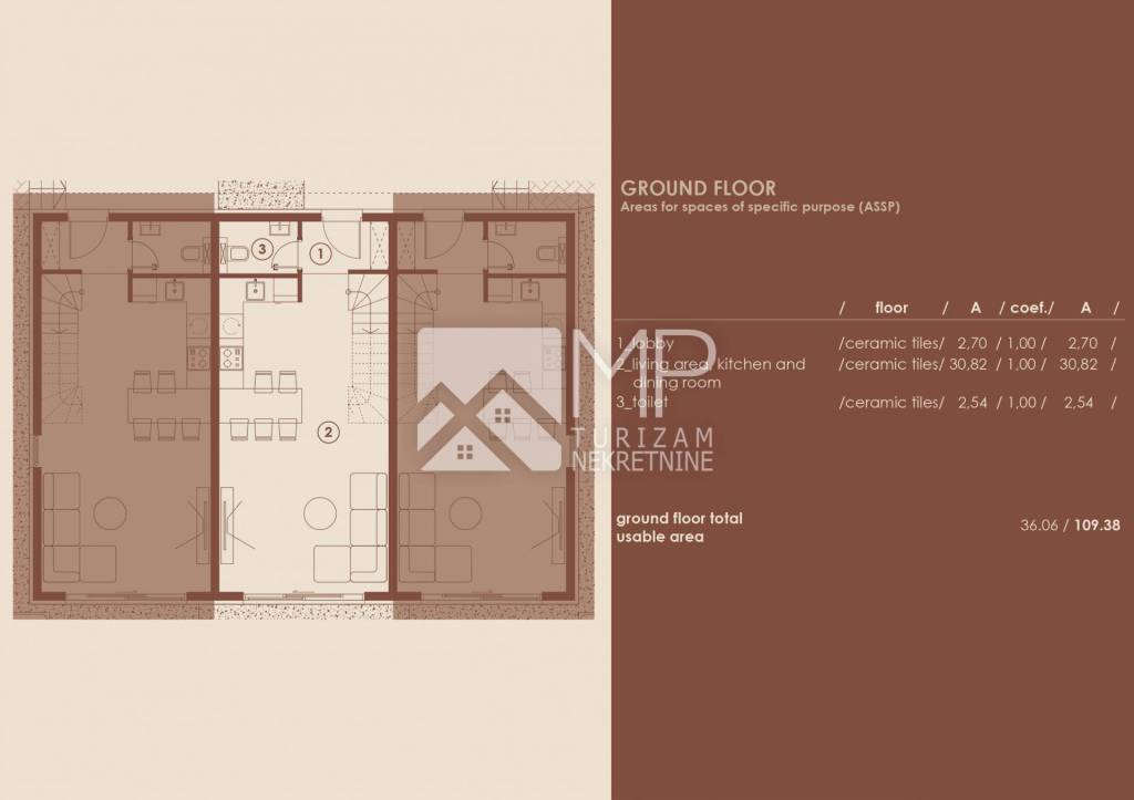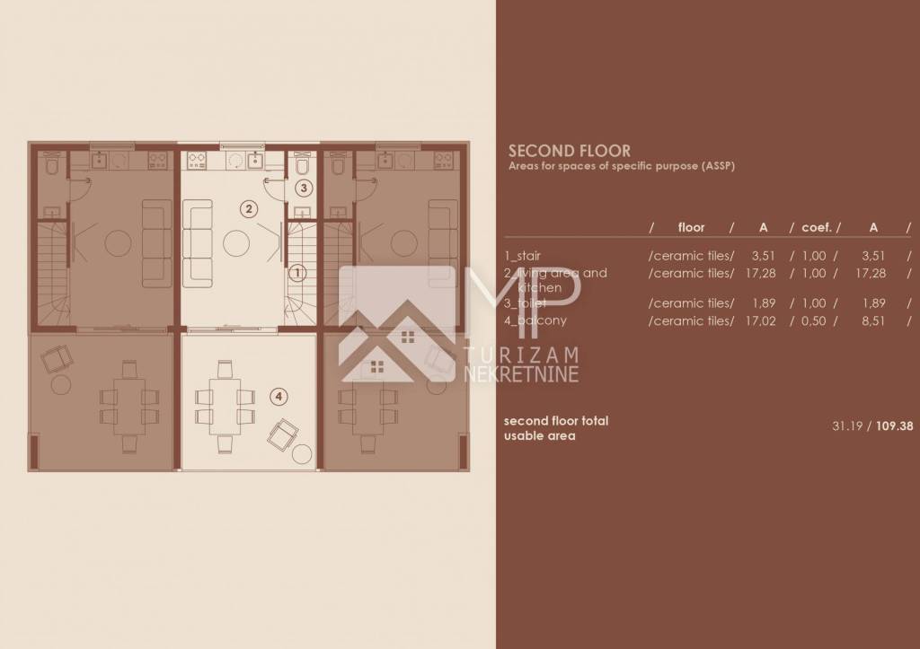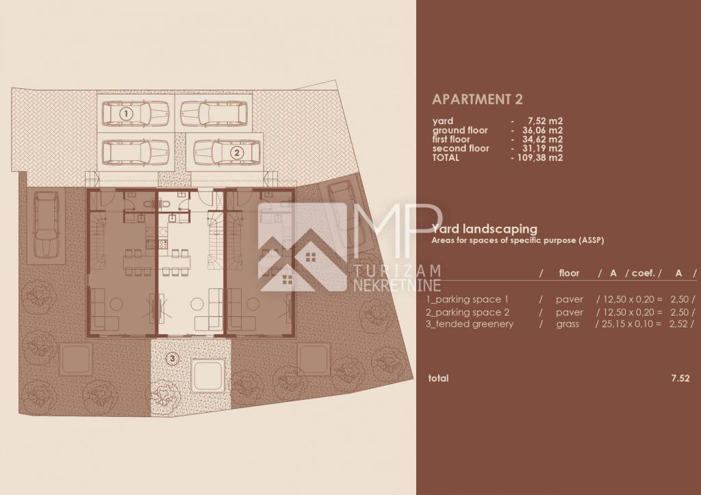 Located in the very south of Istria, in the heart of beautiful Medulin, this three-story apartment offers the perfect blend of Mediterranean charm, modern luxury and privacy. Once a small fishing village, Medulin is today known for its beautiful beaches, superb gastronomy and numerous outdoor activities. For sale is an apartment marked "2" with an area of ​​110 m², consisting of: